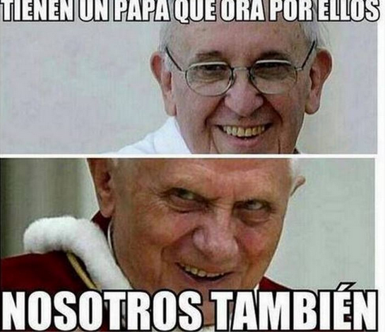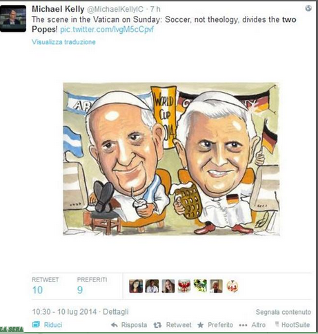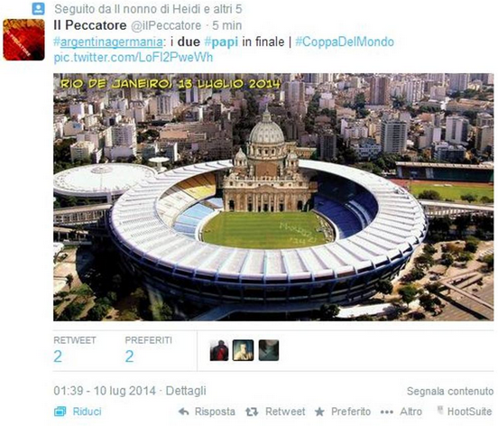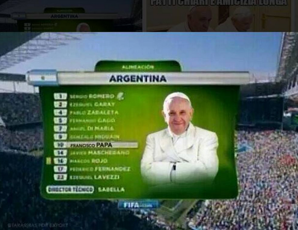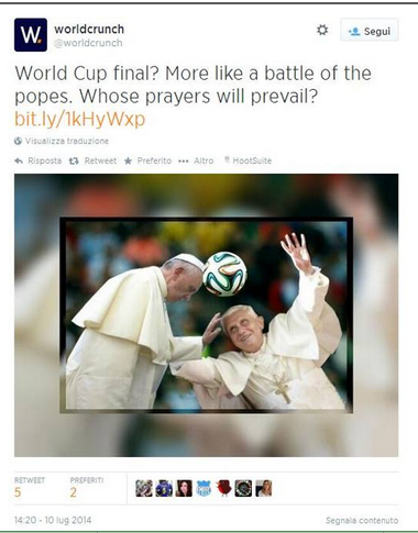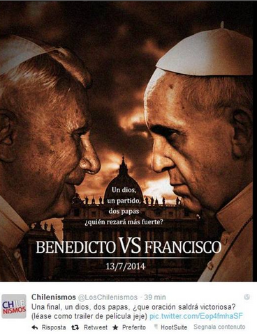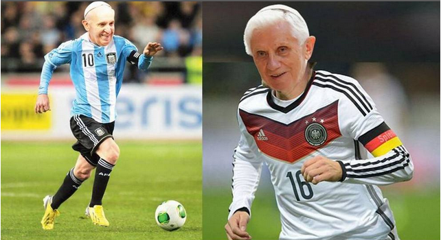 VATICANO – La finalissima del Maracanà è anche la sfida tra due Pontefici: il reggente Bergoglio, argentino, e il Papa emerito Ratzinger, tedesco. Il particolare non è sfuggito agli utenti dei social network che hanno realizzato alcuni divertenti fotomontaggi.