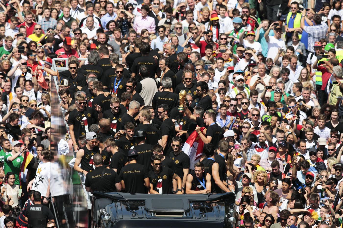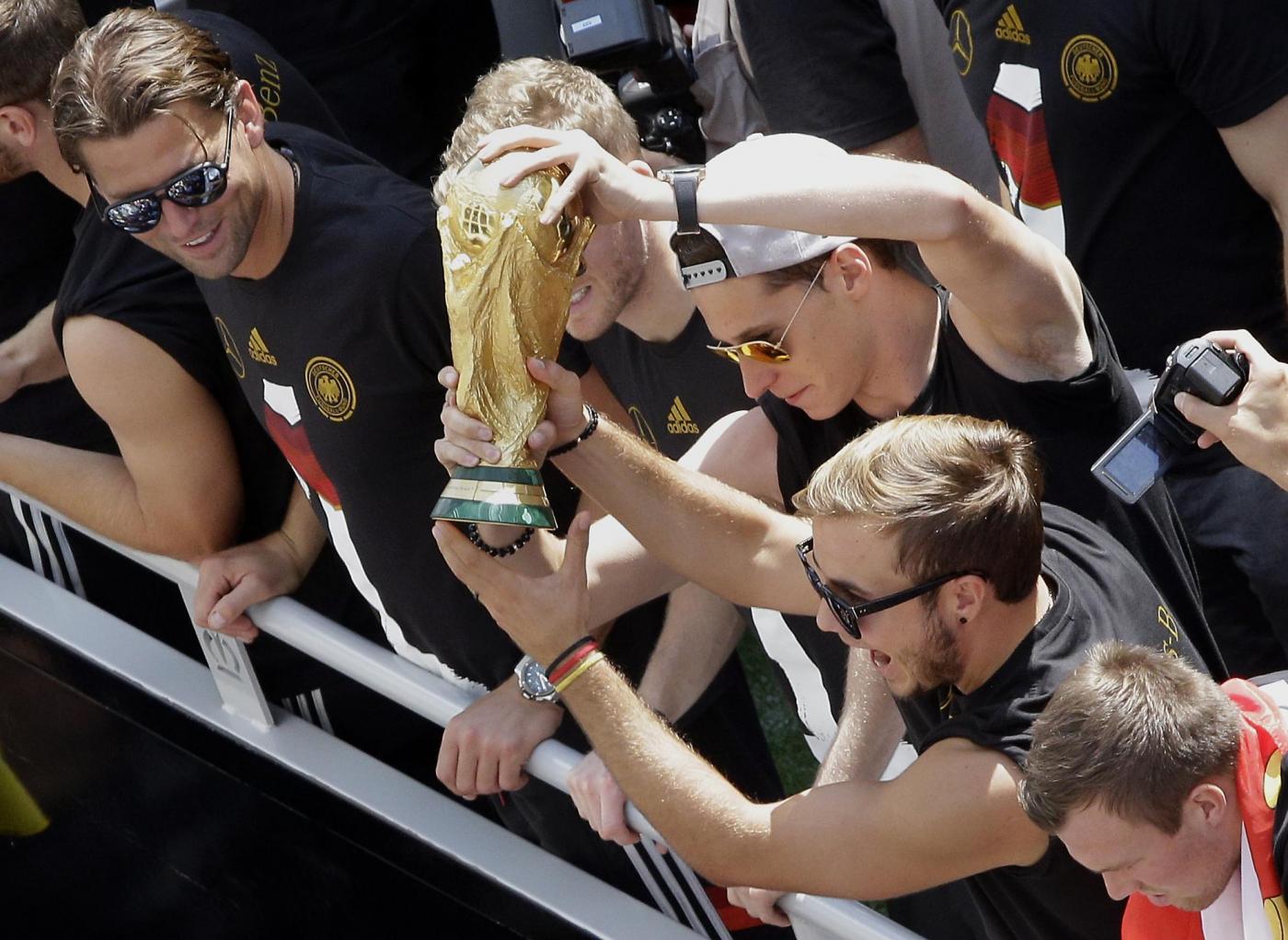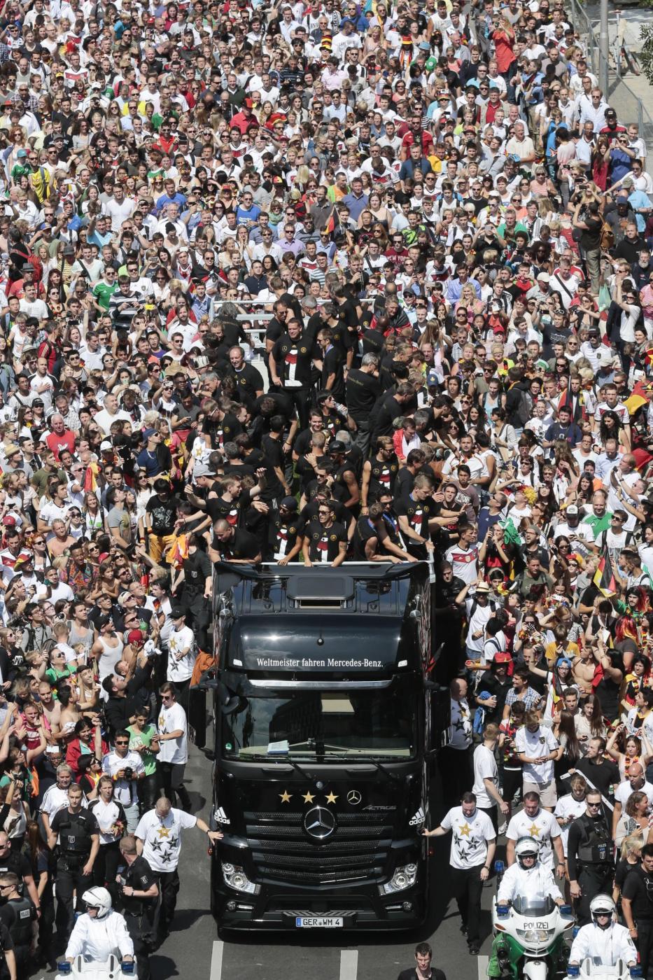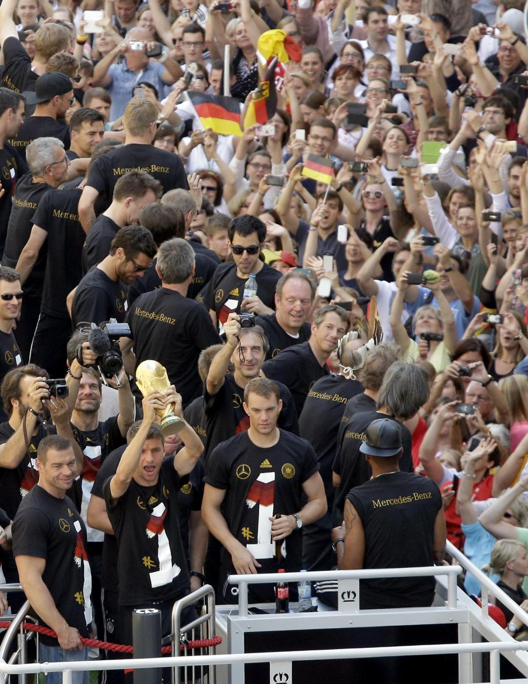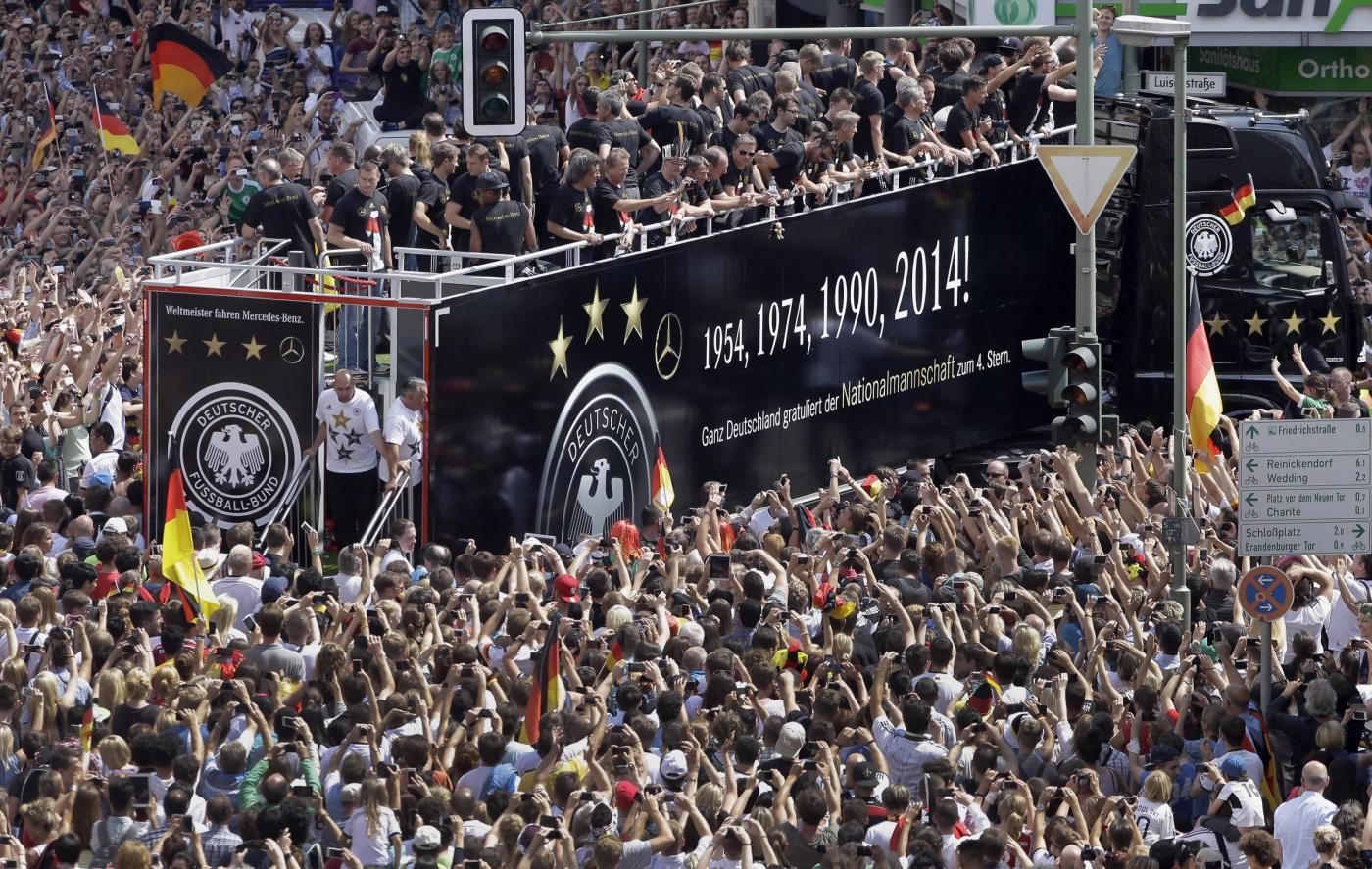 BERLINO – Dopo essere atterrata qualche minuto dopo le 10 all’aeroporto Berlino-Tegel, la nazionale della Germania campione del mondo ha raggiunto Berlino ed ha cominciato a sfilare su un bus a cielo aperto lungo la Spree – il canale della città. Qui, un mare di fan stanno acclamando la squadra di Joachim Loew. Il pullman si dirige verso la porta di Brandeburgo, per festeggiare la quarta stella: il quarto titolo di campioni del mondo conquistato in Brasile.
