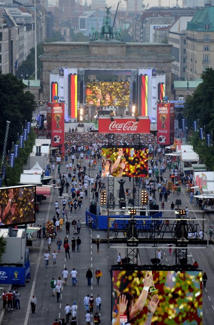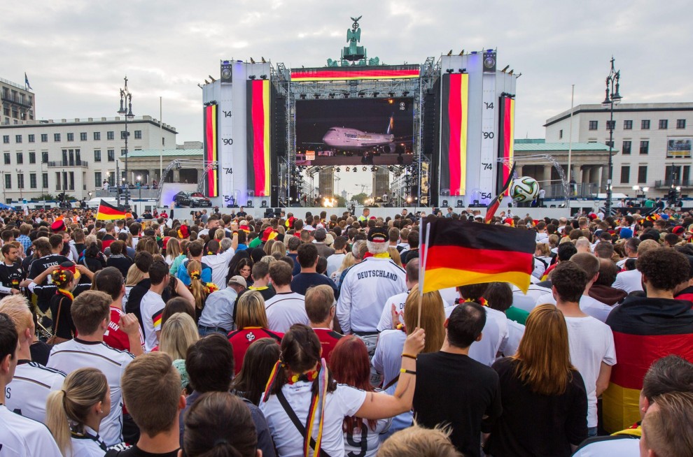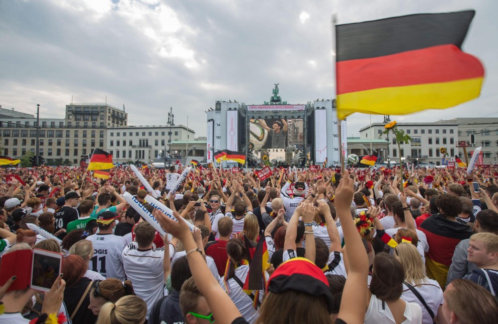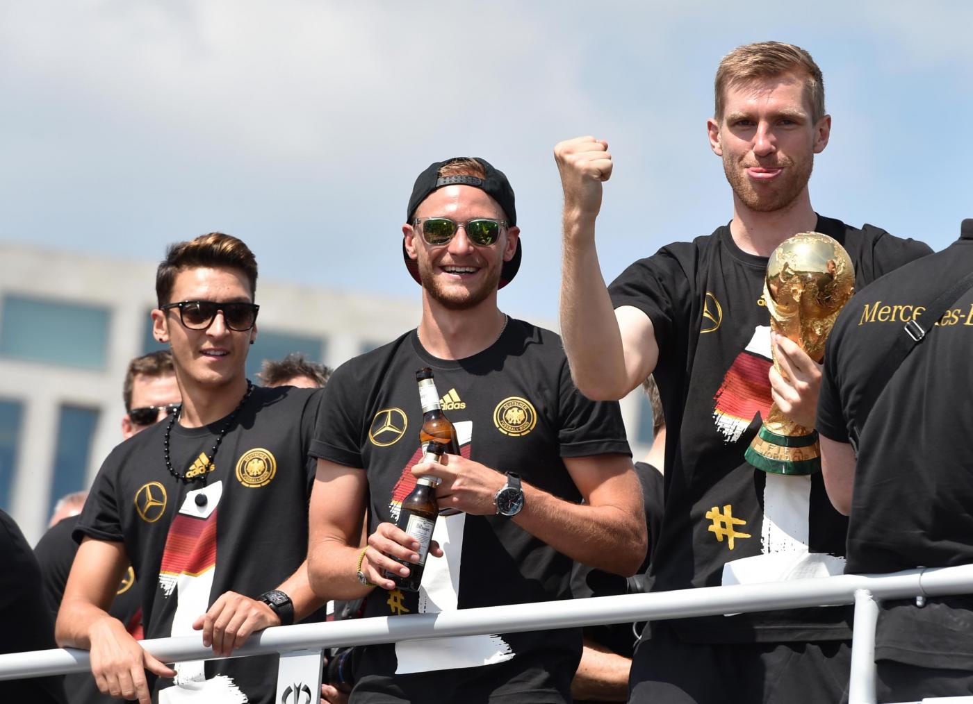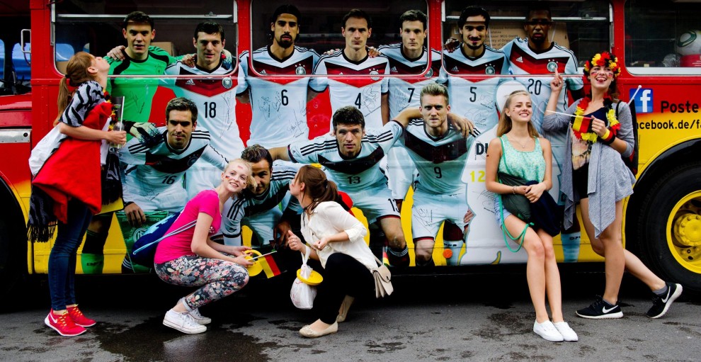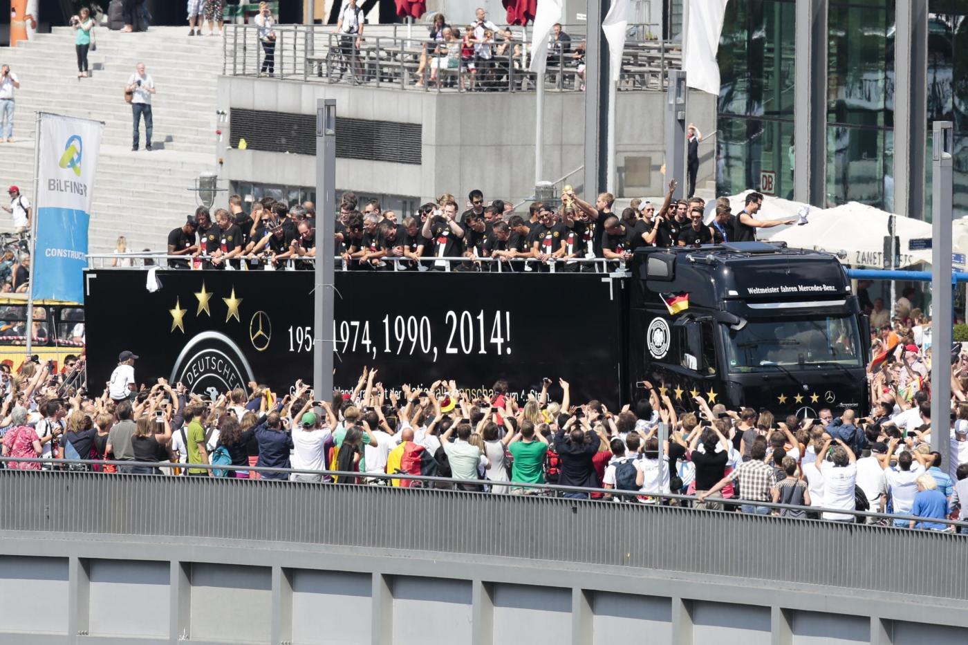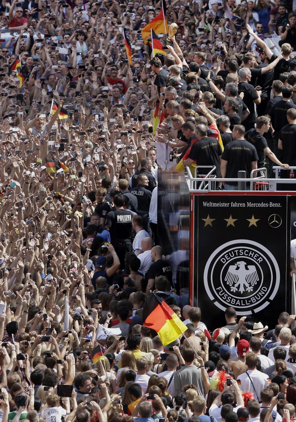 BERLINO – Dopo essere atterrata qualche minuto dopo le 10 all’aeroporto Berlino-Tegel, la nazionale della Germania campione del mondo ha raggiunto Berlino ed ha cominciato a sfilare su un bus a cielo aperto lungo la Spree – il canale della città. Qui, un mare di fan stanno acclamando la squadra di Joachim Loew. Il pullman si dirige verso la porta di Brandeburgo, per festeggiare la quarta stella: il quarto titolo di campioni del mondo conquistato in Brasile.