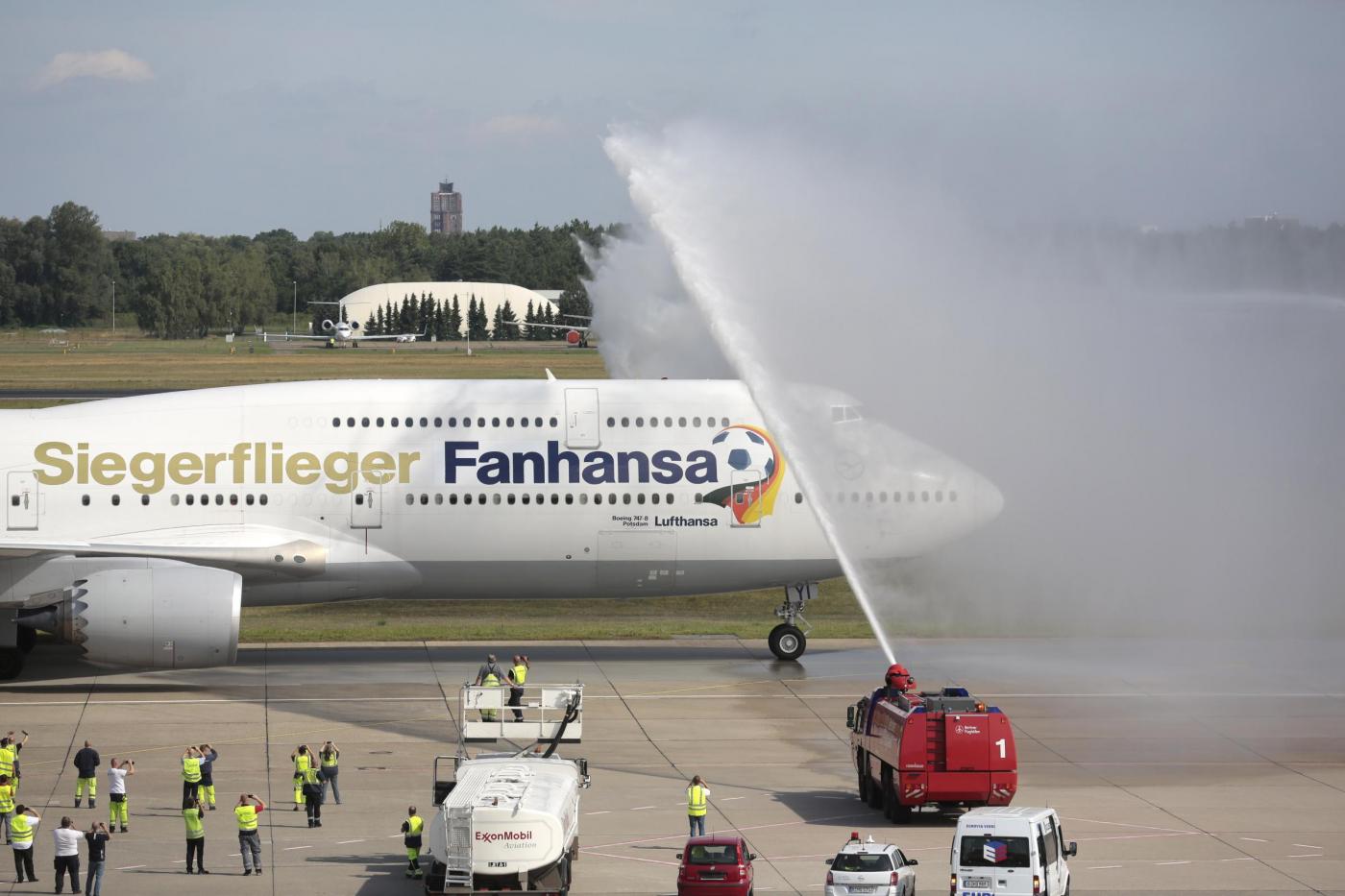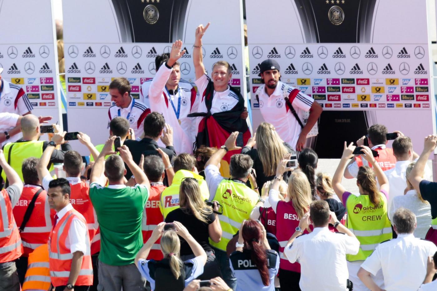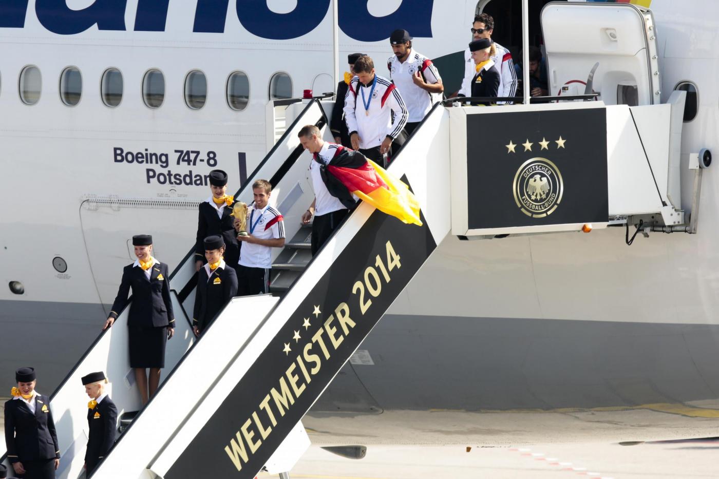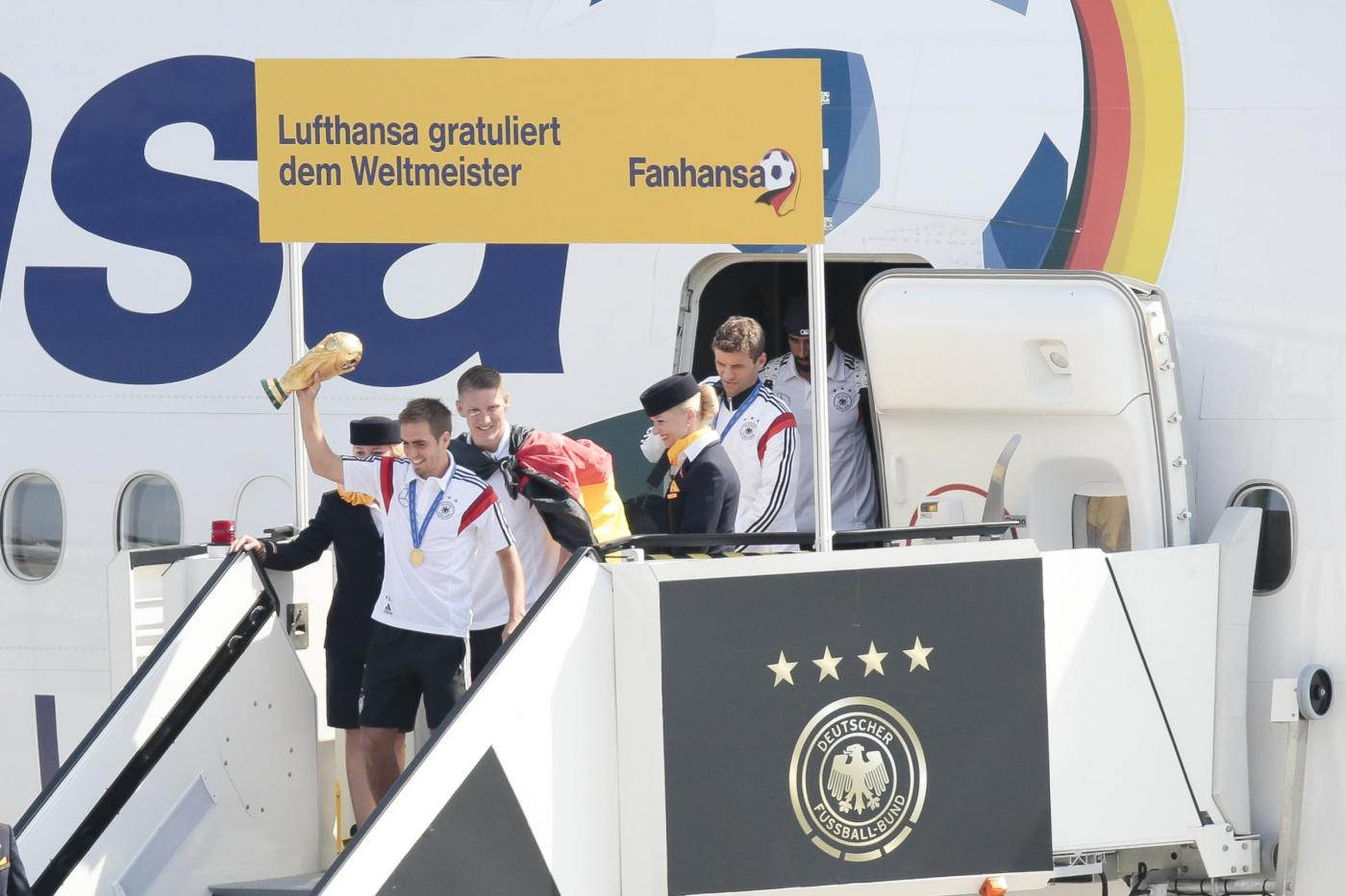L’aereo che ha riportato dal Brasile la Germania, dopo essere atterrato è stato accolto da decine di migliaia di tifosi. Centinaia di persone, radunate su una terrazza dello scalo, sono state le prime ad assistere all’atterraggio. Il primo ad uscire dal portello del Boeing 747 della Lufthansa è stato il capitano Philipp Lahm, con la coppa in mano.