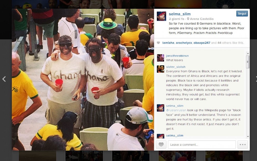 SAN PAOLO – Due tifosi della Germania sono stati fotografati con il volto dipinto di nero durante il match della loro nazionale contro il Ghana.
