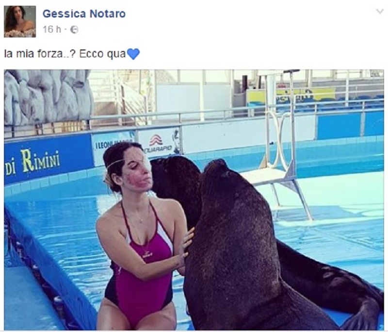 RIMINI – Gessica Notaro è tornata dai suoi amati leoni marini all’Acquario di Rimini dove la miss lavorava prima che il suo ex Edson Eddy Tavares le sfregiasse il volto con l’acido. non potrà più nuotare in vasca con loro, ma presenterà gli spettacoli serali.