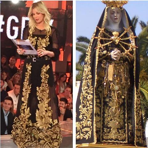 “Ha lasciato perplessi tanti spettatori un abito indossato da Alessia Marcuzzi durante l’ultima puntata del Grande Fratello 14. Anzi, qualcuno ha avuto una sorta di Deja vù: quel velo nero, i decori color oro… ma sì, ecco dove hanno potuto vederlo, in processione! Lo sfottò sul web non si è fatto attendere, la Marcuzzi – visti anche gli ascolti di questa edizione del GF – sembrava proprio la Madonna Addolorata”.