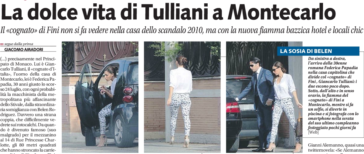 MONTECARLO – La storia di amore tra Giancarlo Tulliani e Federica Papadia finisce nel mirino di Giacomo Amadori per Libero quotidiano. Amadori parla della coppia, che va avanti tra la voglia di privacy di Tulliani, il “cognato d’Italia” noto alle cronache per la casa a Montecarlo di Gianfranco Fini, e lo spirito social della bella Federica, 30 anni, che guida i treni della metro e scrive sul suo fashion blog, coltivando anche Twitter, Facebook e Instagram.