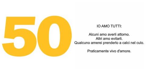 “Vi amo tutti. Alcuni amo averli attorno. Altri amo evitarli. Qualcuno amerei prenderlo a calci nel culo. Praticamente vivo d’amore”.