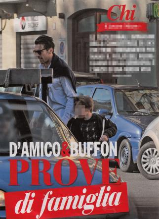 Ilaria D’Amico elegante in un tubino nero con scollo a V e unghie laccate di rosso, mentre Buffon ha sfoggiato il suo nuovo taglio di capelli.