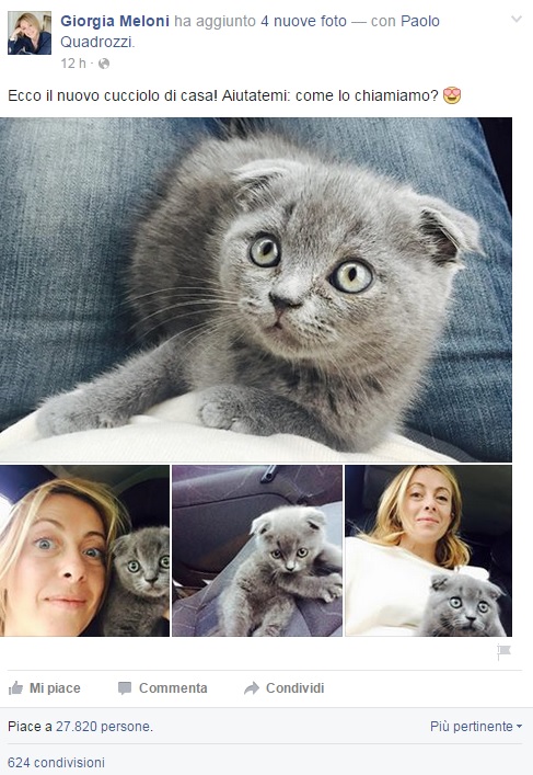 ROMA – Giorgia Meloni si è presa un gattino. La presidentessa di Fratelli D’Italia ha mostrato orgogliosa il suo amico a quattro zampe sulla sua pagina Facebook, chiedendo aiuto ai suoi fan per quanto riguarda la scelta del nome.