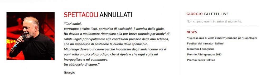 ”Cari amici, purtroppo a volte l’età, portatrice di acciacchi, è nemica della gioia. Ho dovuto a malincuore rinunciare alla pur breve tourneé per motivi di salute legati principalmente alle condizioni precarie della mia schiena, che mi impedisce di sostenere la durata dello spettacolo. Mi piange davvero il cuore perché incontrare degli amici come voi è ogni volta un piccolo prodigio che si ripete e che ogni volta mi inorgoglisce e mi commuove. Un abbraccio di cuore. Giorgio”.