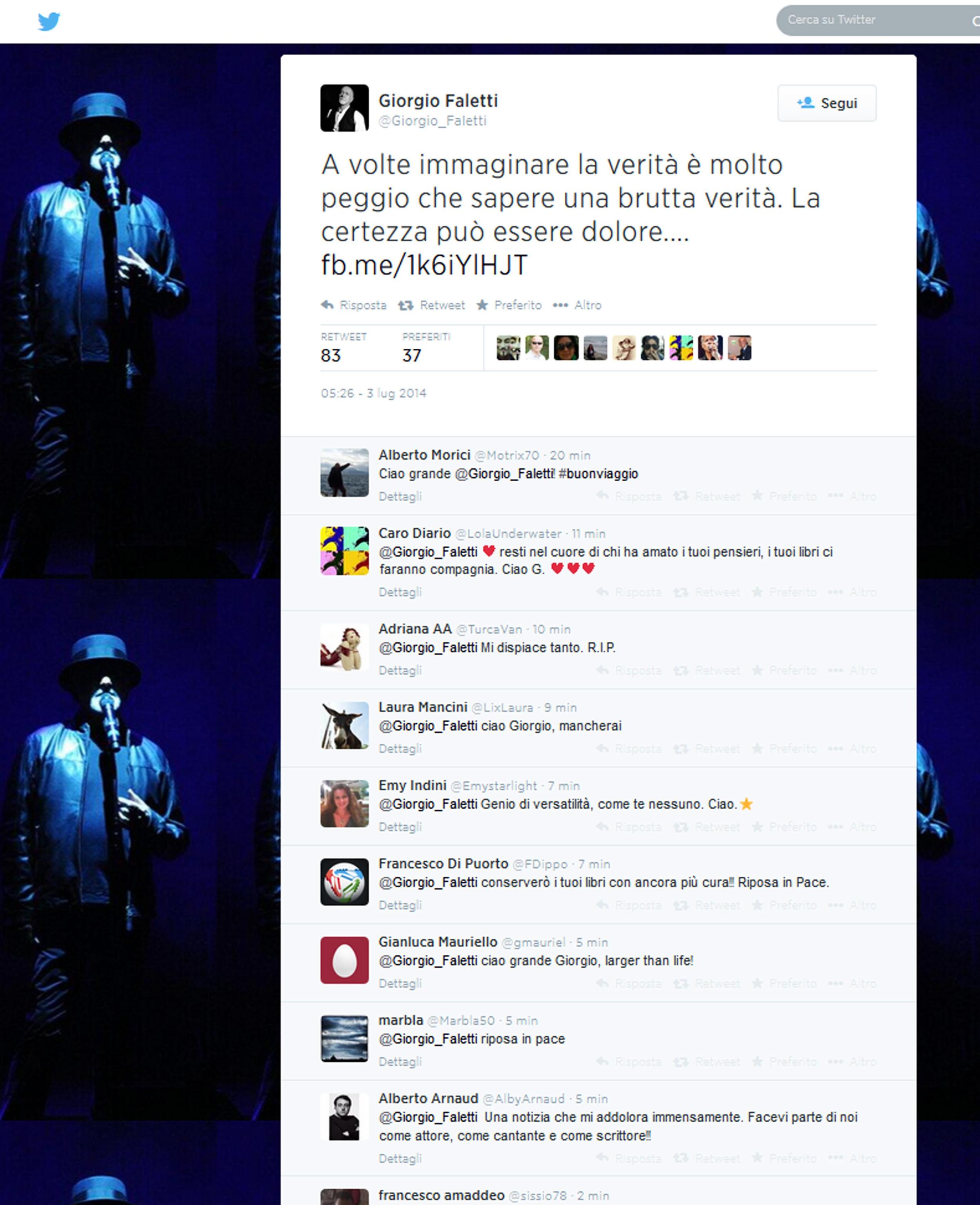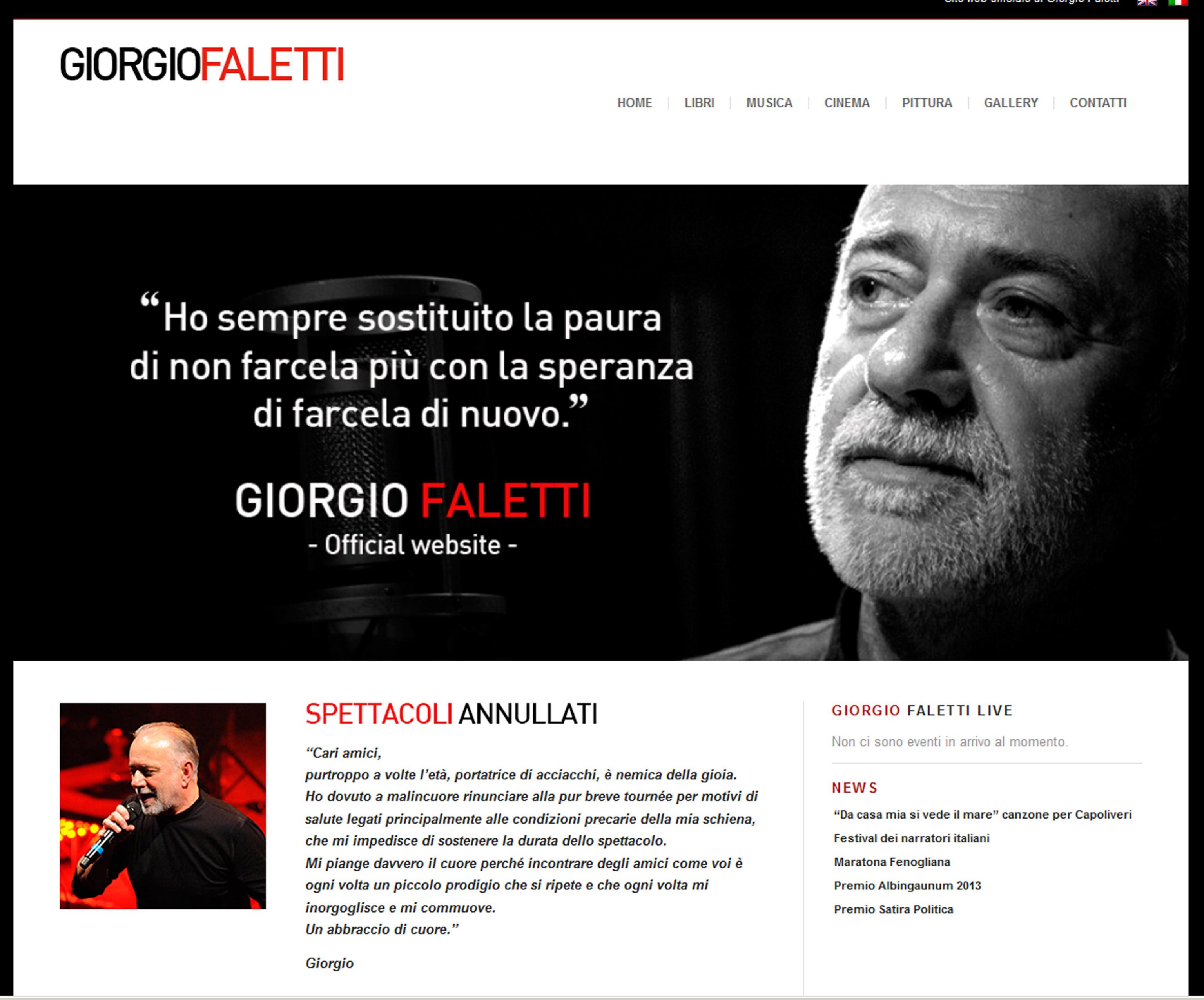 TORINO – “Cari amici, l’età a volte è nemica della gioia“. Questo l’ultimo messaggio ai fan di Giorgio Faletti, morto il 4 luglio a Torino, in cui dal suo sito annunciava la cancellazione della sua tourneé. Cause di salute, spiegava Faletti, che da tempo era malato e per cui sostenere la durata dello spettacolo era difficile.
