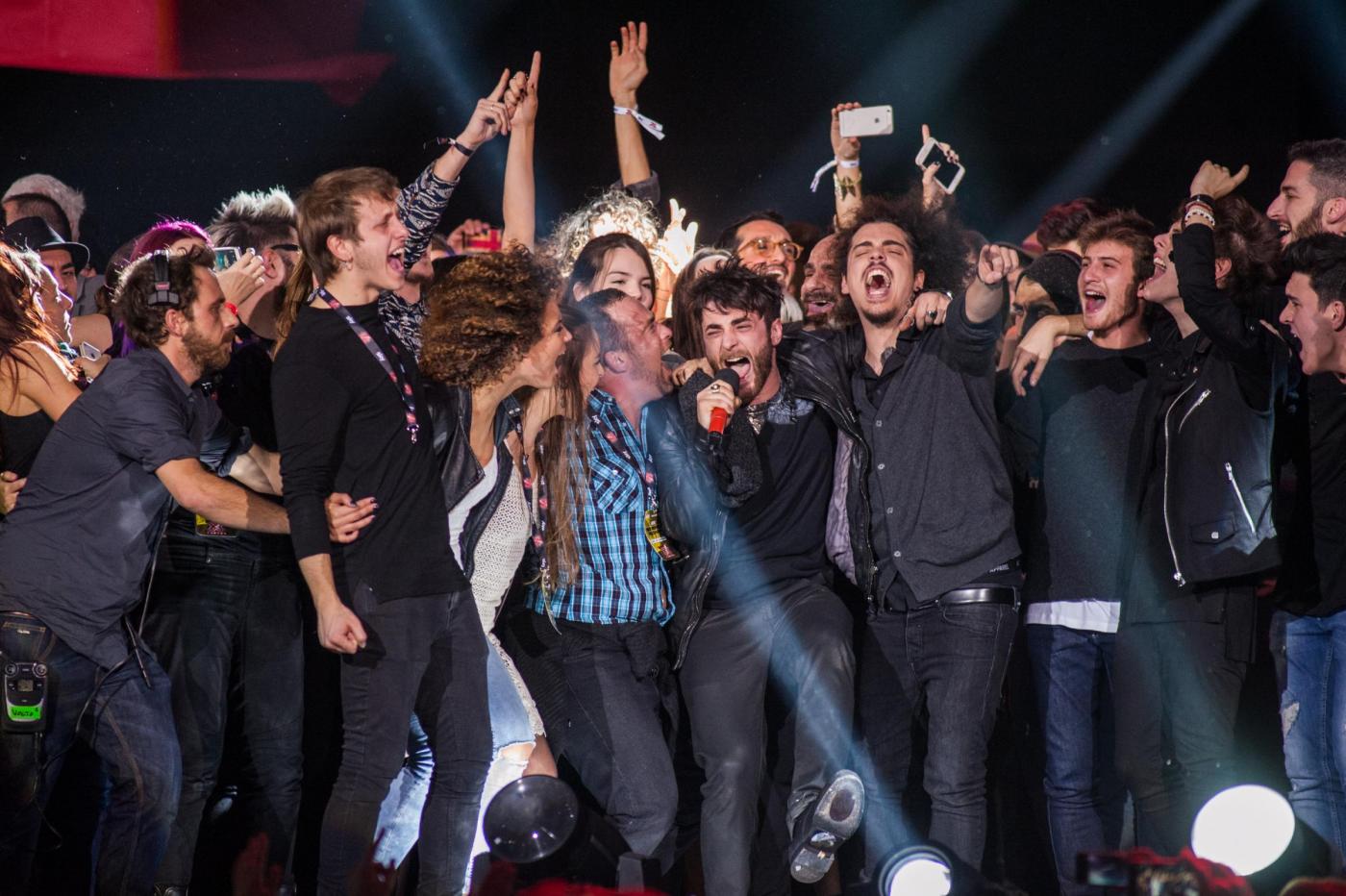 Prima del verdetto del televoto che ha decretato l’eliminazione di Davide, sul mastodontico palco ad x del Mediolanum Forum sono saliti anche gli Elio e Le Storie Tese al gran completo per cantare ‘ Servi della gleba’, assieme alla vocal coach Paola Folli che della band è stata anche corista (foto LaPresse).