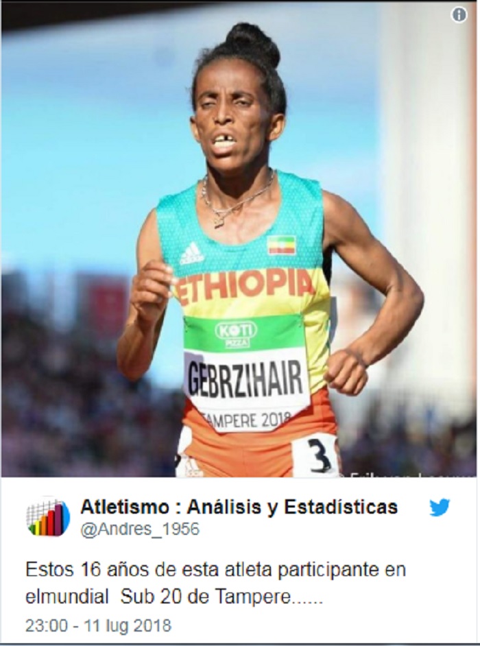 TAMPERE – Girmawit Gebrzihair, secondo i documenti depositati ufficialmente alla Federazione Internazionale di Atletica non avrebbe ancora compiuto 17 anni [App di Blitzquotidiano, gratis, clicca qui,- Ladyblitz clicca qui –Cronaca Oggi, App on Google Play], essendo nata il 21 novembre del 2001.