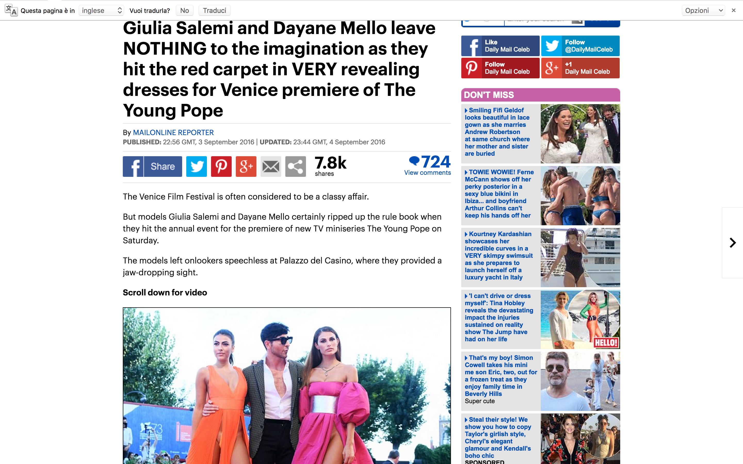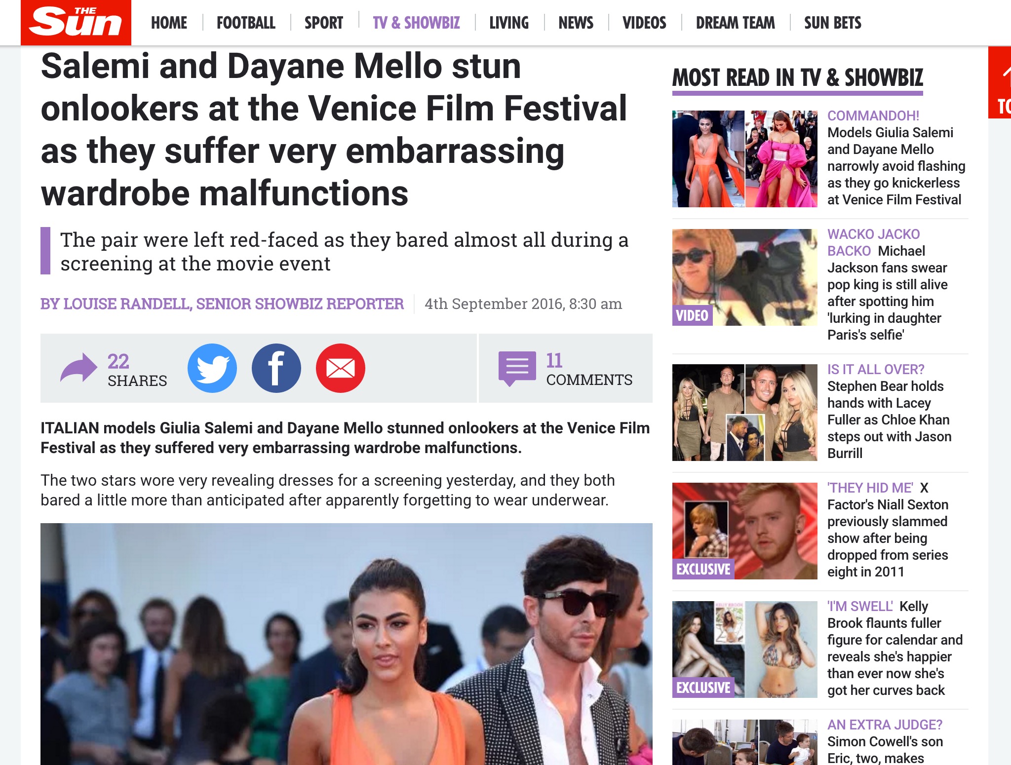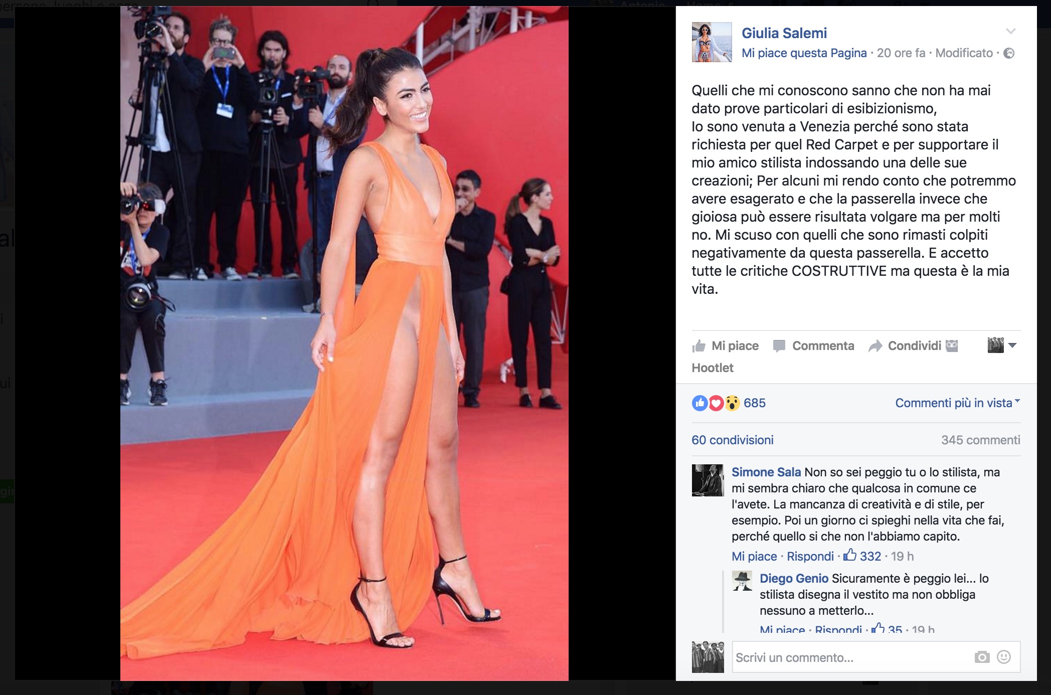 “Quelli che mi conoscono – aveva scritto su Facebook – sanno che non ha mai dato prove particolari di esibizionismo, Io sono venuta a Venezia perché sono stata richiesta per quel Red Carpet e per supportare il mio amico stilista indossando una delle sue creazioni; Per alcuni mi rendo conto che potremmo avere esagerato e che la passerella invece che gioiosa può essere risultata volgare ma per molti no. Mi scuso con quelli che sono rimasti colpiti negativamente da questa passerella. E accetto tutte le critiche COSTRUTTIVE ma questa è la mia vita”.