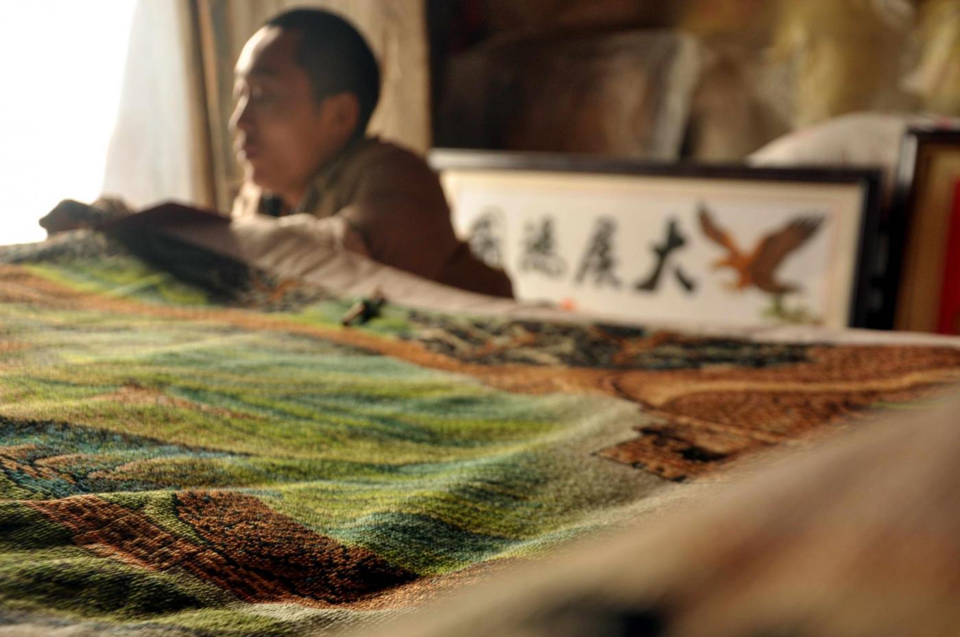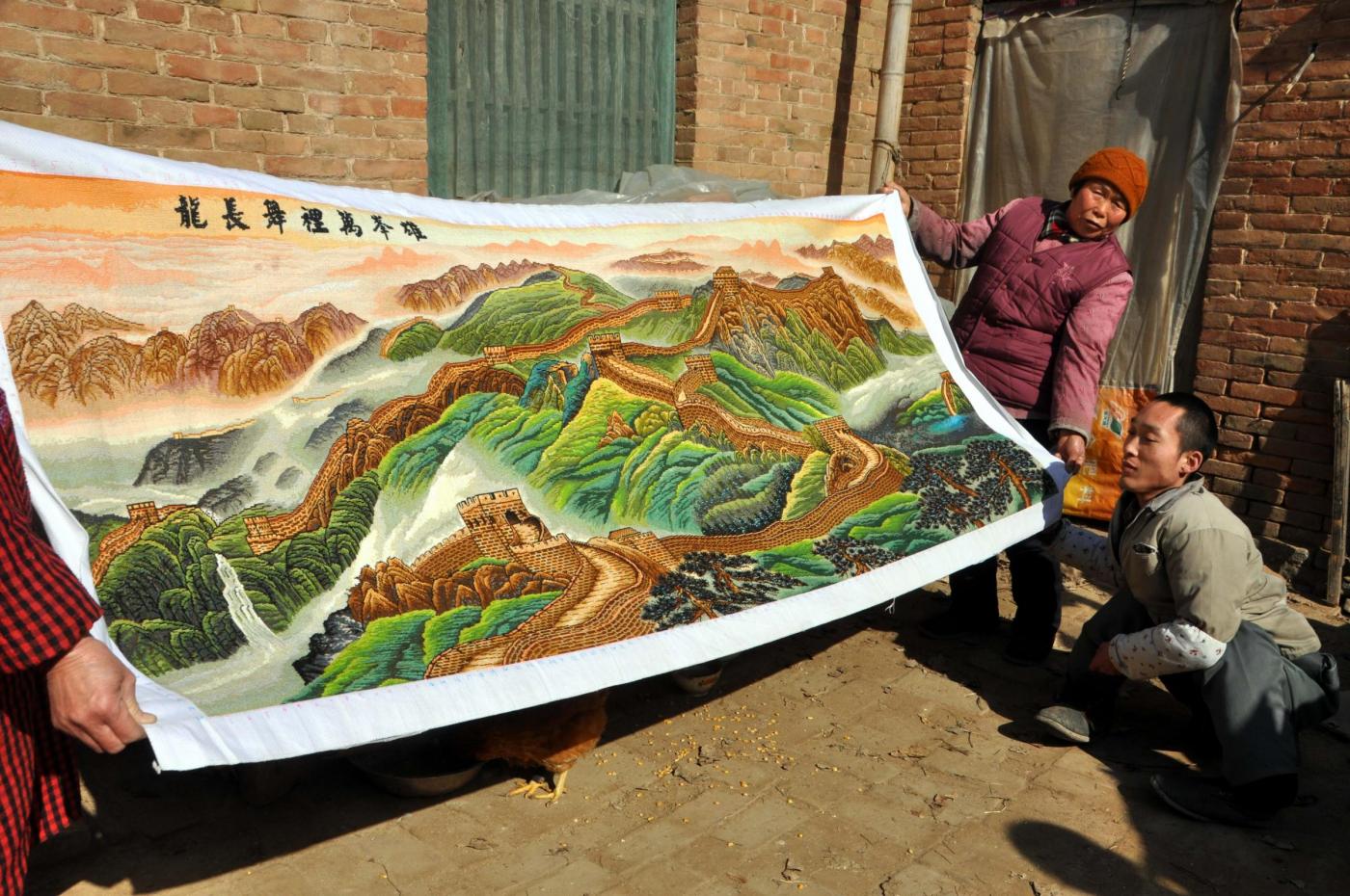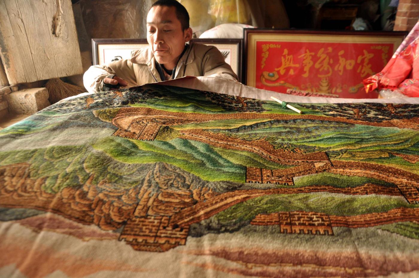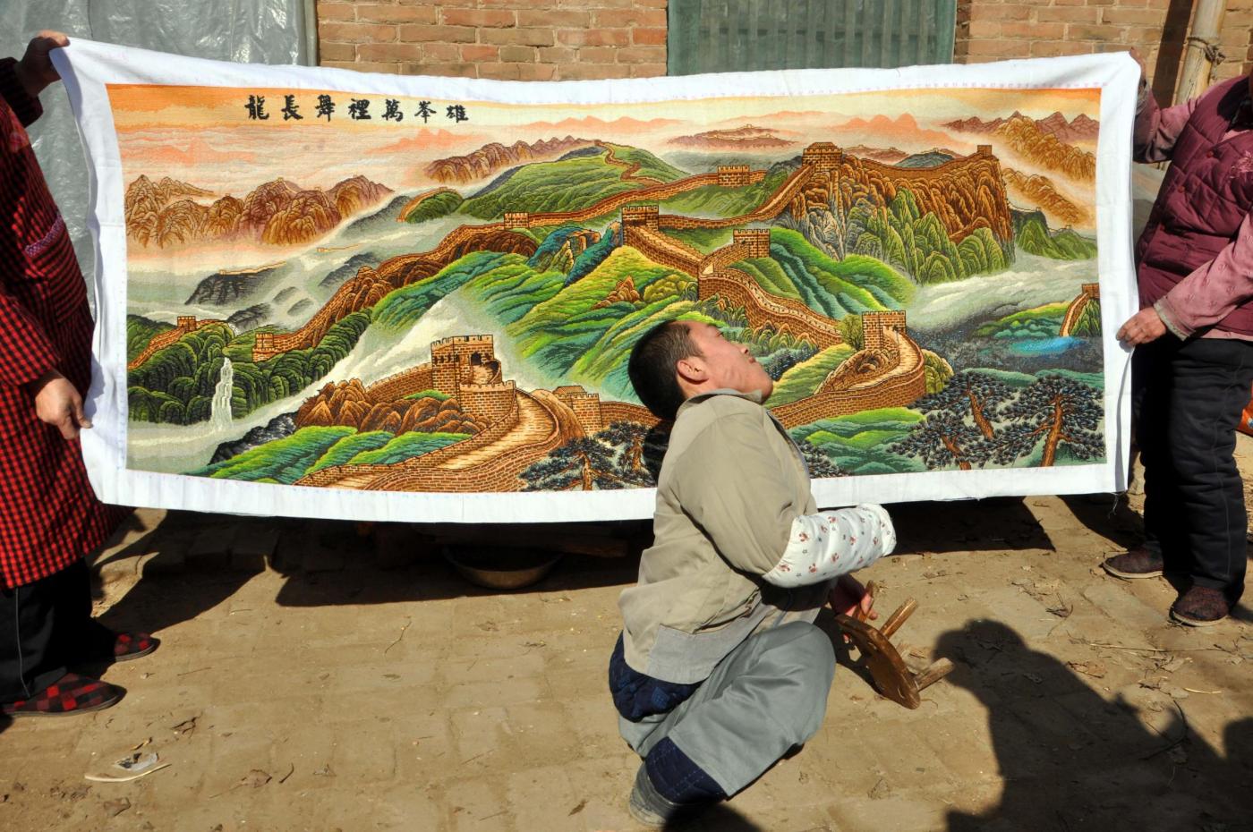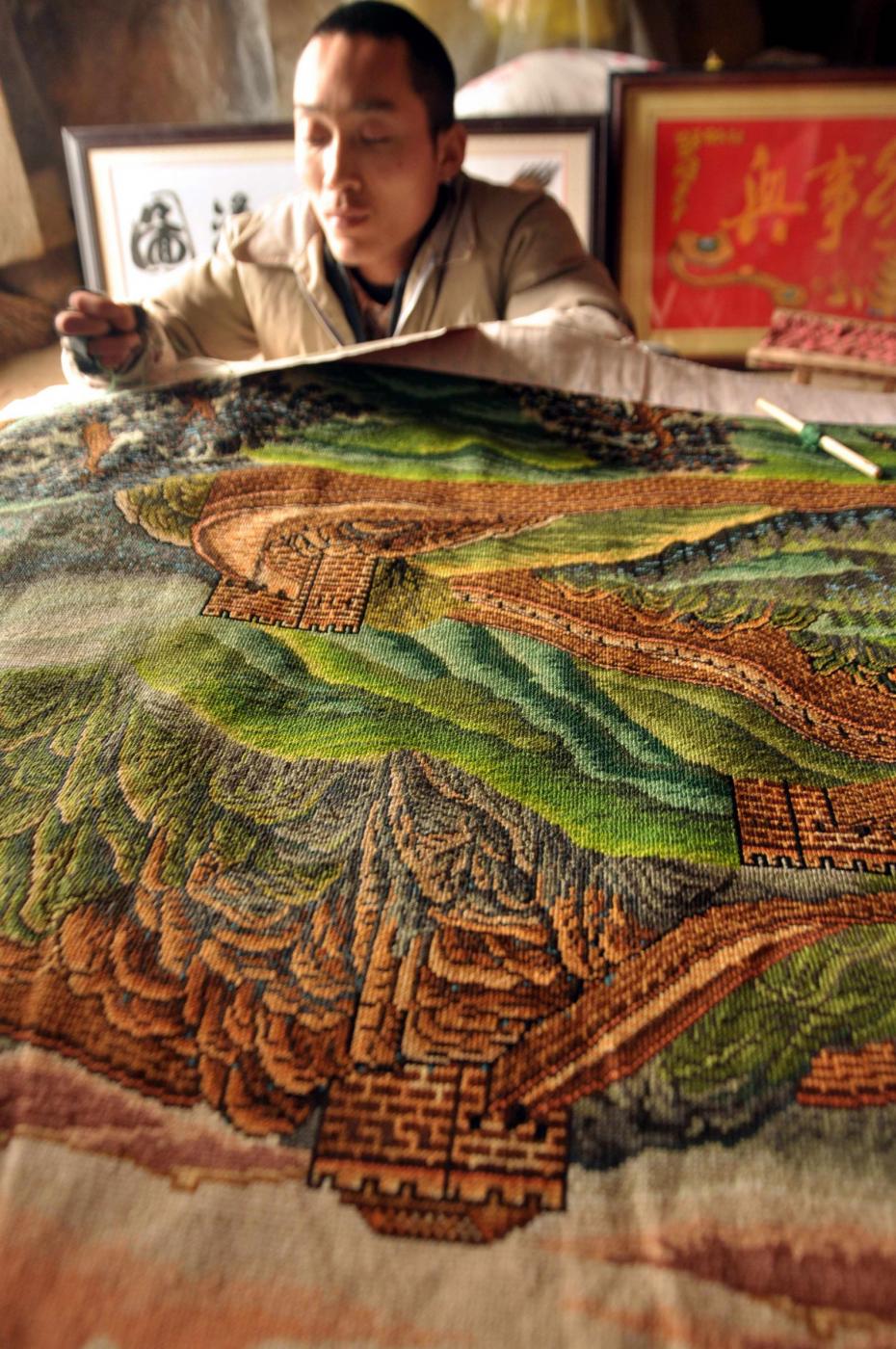 PECHINO (CINA) – Un disabile cinese di 26 anni ha realizzato un tappeto ricamato a mano che raffigura la Grande Muraglia cinese. Per la sua opera, il giovane ha lavorato 486 giorni. Il peso del tappeto è di circa due chili, per poco più di due metri di lunghezza e uno di larghezza. Il giovane ha utilizzato 80 tipi di filo e 398.200 cuciture per completare la sua opera che ritrae uno dei monumenti più imponenti e famosi al mondo. L’opera è stata realizzata nella provincia costiera dello Shandong, situata lungo la regione più orientale della Cina (foto LaPresse):