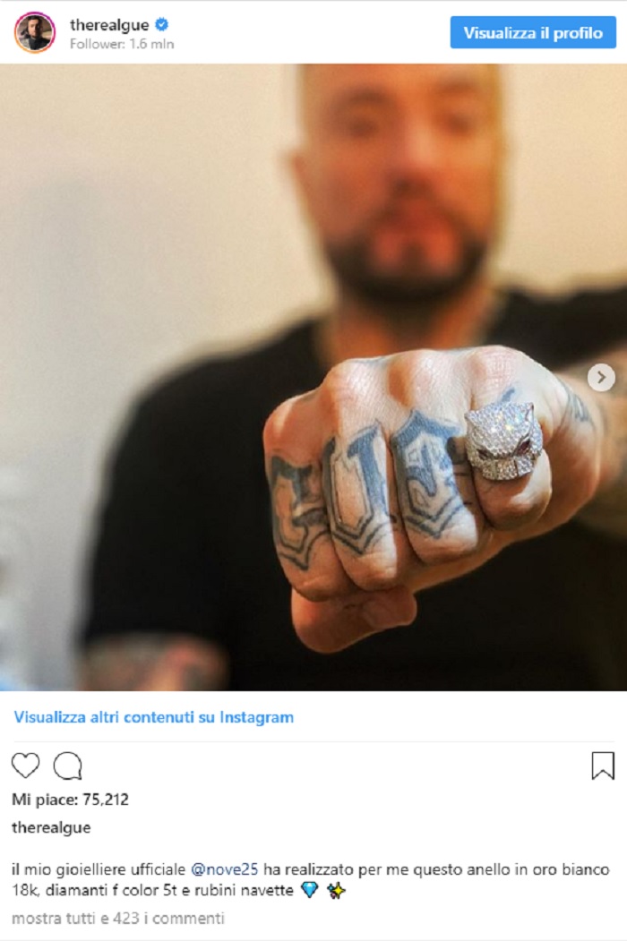 ROMA – Gue Pequeno pubblica sul suo account Instagram una foto che mostra il suo nuovo gioiello realizzato appositamente per lui da Nove25. Si tratta di un anello a forma di testa di puma in oro bianco 18 carati tempestato, come se non bastasse, di diamanti e rubini.