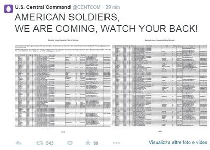 WASHINGTON – Gli hacker dell’Isis hanno attaccato l’account Twitter di Centcom, il comando militare centrale per la regione mediorientale, e mandato un messaggio ai militari degli Stati Uniti. “Soldati americani,vi stiamo controllando”, hanno scritto gli hacker simpatizzanti della jihad sul profilo del Centcom.