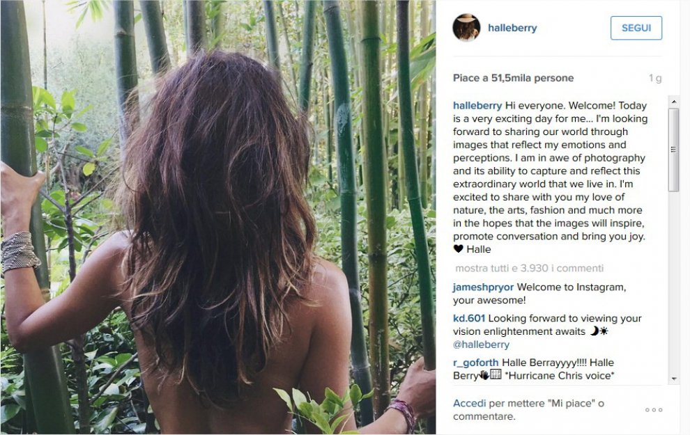 “Non vedo l’ora di condividere il nostro mondo attraverso immagini che riflettono le mie emozioni e percezioni” scrive l’attrice, che definisce “un giorno emozionante” quello del suo arrivo su Instagram. Nell’immagine pubblicata, la Berry appare di spalle con i capelli sciolti e in topless in mezzo alla jungla.