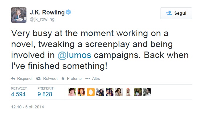 Per alcuni giorni gli ammiratori del maghetto sono rimasti con il fiato sospeso. Poi è stata la stessa scrittrice britannica a svelare l’arcano: sta lavorando alla sceneggiatura di un film (il primo di una trilogia) sul mago Newst Scamander, l’autore immaginario di un testo scolastico sugli animali magici che si trova nei romanzi di Harry Potter.