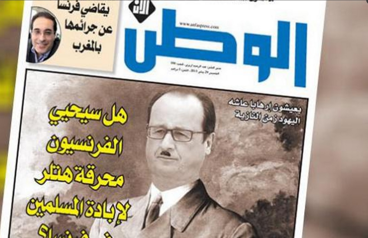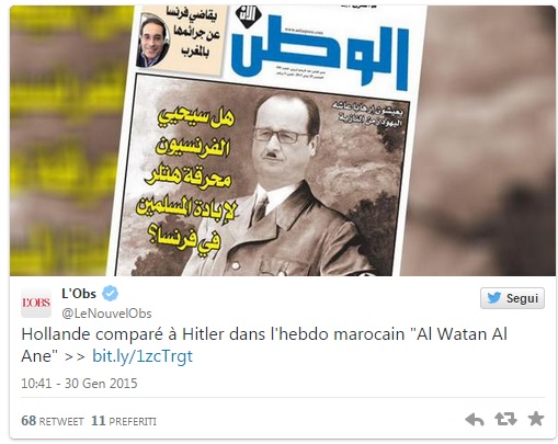 PARIGI – Francois Hollande come Hitler sulla prima pagina di un settimanale marocchino, con l’accusa di voler sterminare i musulmani. L’immagine del presidente francese in copertina con i caratteristici baffetti e svastica ha accesso le polemiche, in un momento in cui le relazioni tra Parigi e Rabat non sono allo zenit. “I francesi faranno rinascere i campi di concentramento di Hitler per sterminare i musulmani?” e’ il provocatorio titolo, che vuole essere “un campanello d’allarme per la classe politica in Marocco e in Francia”, ha spiegato il direttore di Al Watan Al An, Abderrahim Ariri, ripreso da Le Figaro.