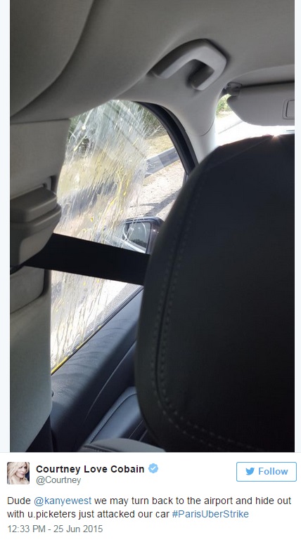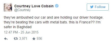 Tra gli autisti bloccati c’era anche quello di Courtney Love, che ha sfogato la propria ira contro i tassisti su Twitter: “Hanno teso un agguato alla nostra auto e stanno tenendo in ostaggio il nostro autista. Stanno colpendo le auto con bastoni di metallo. Questa è la Francia? Sono più al sicuro a Baghdad”.