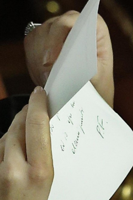 Un biglietto da ammiratore? Lo escludiamo: Casini avrà inviato alla Boschi un messaggio politico, visto che lei è il ministro delle Riforme e dalla sua scrivania passano la legge elettorale e la riforma del Senato, i temi politici caldi del momento. Il testo è illeggibile, solo da una foto si intuisce il finale: “ed io apro su alcuni punti”, sembra di leggere ma non è chiaro. Insomma, nessun biglietto romantico, solo politica.