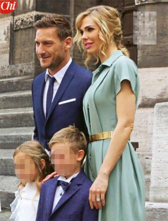 La Blasi, per l’occasione indossa un abito lungo verde acqua ed ha i capelli raccolti. Totti, per assistere al rito ha chiesto qualche ora di permesso visto che era in ritiro con la squadra per preparare il derby che si giocherà lunedì. I due figli sembrano la fotocopia di mamma Ilary e papà Francesco.