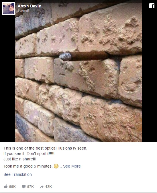 ROMA – Una nuova foto sta facendo impazzire il web. Si tratta di una nuova illusione ottica che si aggiunge a quelle che negli ultimi mesi hanno riempito il web. Ma di cosa si tratta? Nella seconda foto la spiegazione. Apparentemente sembra un normale muro di mattoni. Osservando però bene all’interno, si nota incastrato nel muro un sigaro dal colore simile a quello dei mattoni, che grazie all’illusione prospettica si mimetizza perfettamente tra le vie di fuga dei mattoni.