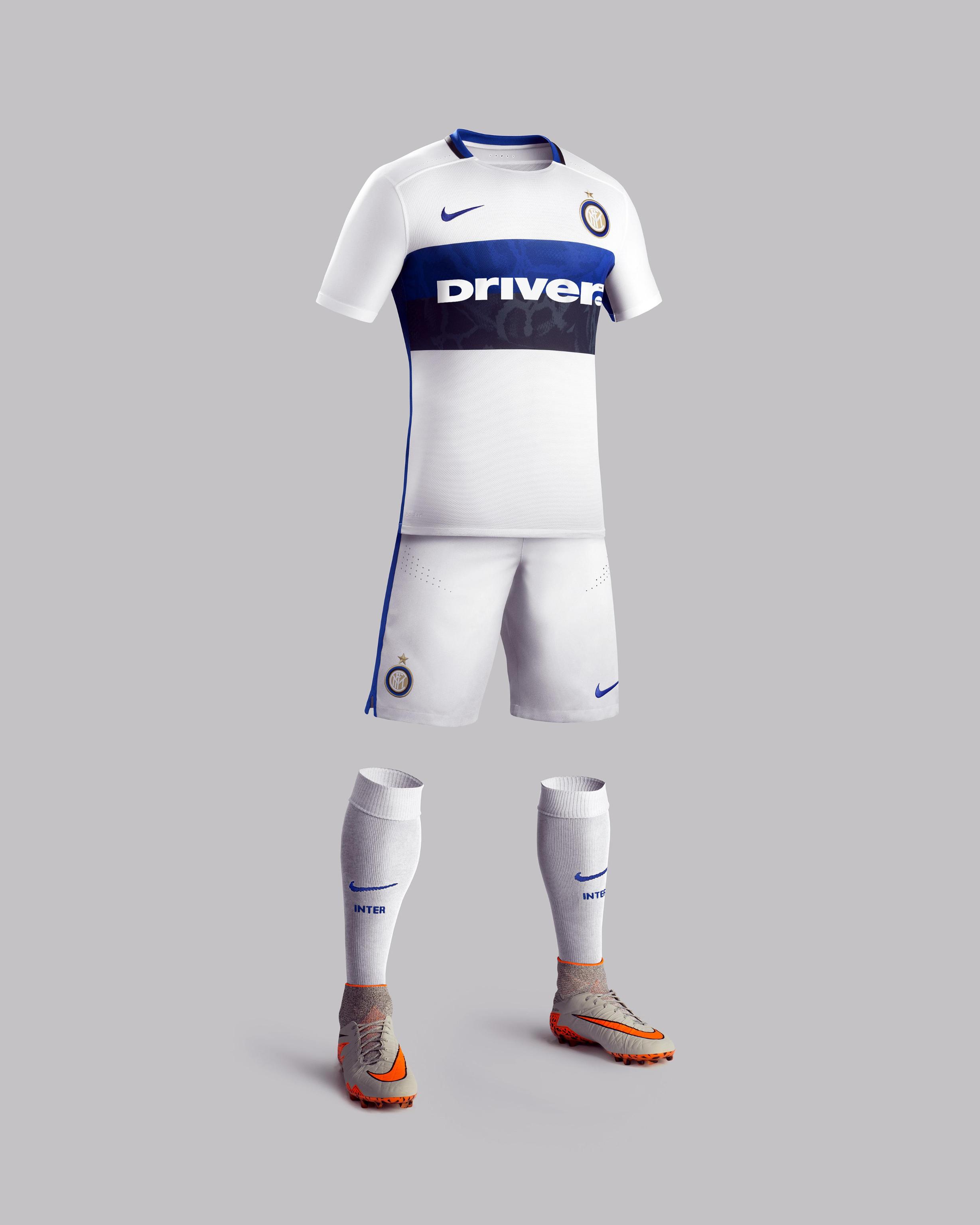 La nuova maglia per le trasferte unisce la tradizione ad un design innovativo. La fascia nerazzurra sul petto presenta una grafica con il disegno della pelle del serpente, il Biscione dell’Inter – storico simbolo di Milano dal XIII secolo – e già rappresentato nella maglia scelta per i match lontano da San Siro nella stagione 2010/2011. I colori nerazzurri appaiono anche nella parte posteriore del girocollo. Una striscia blu corre lungo entrambi i lati della maglia e continua lungo i fianchi dei calzoncini bianchi. Foto Ansa.