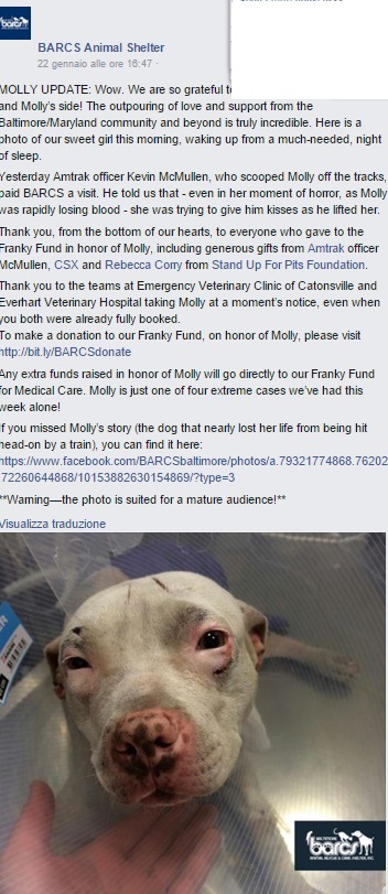 “‘Non ha mai perso conoscenza, anche per questo è un miracolo’ raccontano i volontari del Baltimora Animal Rescue & Shelter Care (Barcs) che sono intervenuti sul luogo dell’incidente. Ma a svolgere un ruolo fondamentale della storia è stato Kevin McMullen, il funzionario della compagnia ferroviaria che ne ha raccolto il corpo martoriato sui binari del treno. «Lui ci ha detto che, anche nel momento più duro della storia, anche se stava perdendo molto sangue, Molly ha cercato di dargli dei baci’ ha scritto su Facebook il Barcs”.