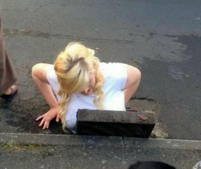 Ella stava passeggiando vicino casa e stava scrivendo col suo smartphone. Il telefonino รจ finito nello scarico e quindi nelle tubature. Lei ha individuato il tombino giusto e si รจ buttata di sotto. E lรฌ รจ rimasta incastrata.
