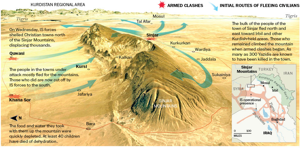 Sinjar ospitava il gruppo più numeroso di Yazidi tra i suoi 250.000 abitanti, prima di essere conquistata in una nuova offensiva dei jihadisti. Almeno 200.000 civili si sono dati alla fuga, secondo fonti dell’Onu, e molti sono rimasti bloccati sulle montagne, dove ora rischiano di essere uccisi dalla fame e dalla sete.