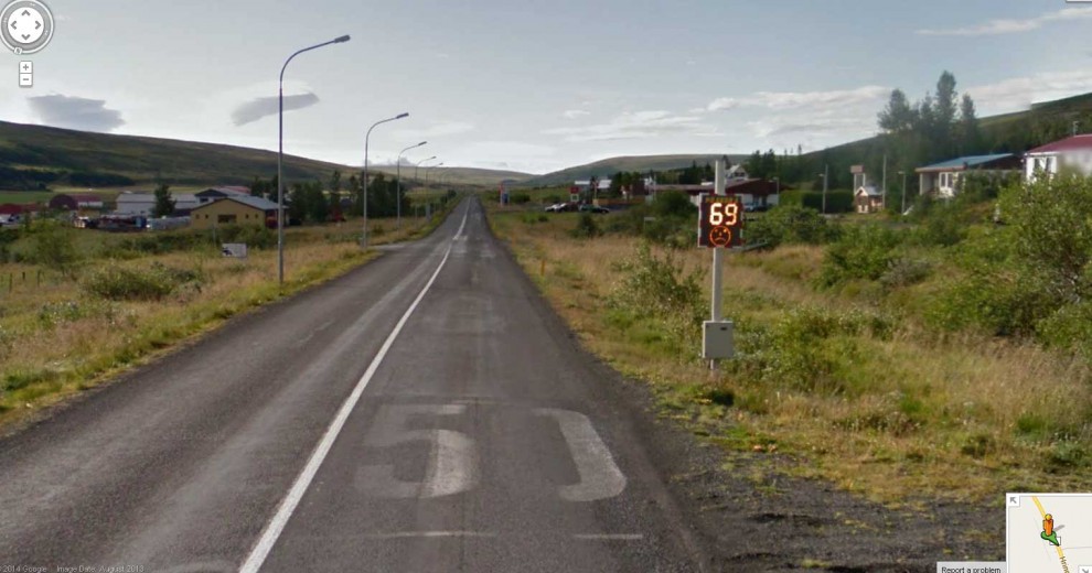 L’auto scatta immagini per il servizio Street view e viene “pizzicata” da un autovelox. In questo tratto stradale il limite sull’asfalto segna 50 chilometri orari. La Google car sta però correndo troppo: il pannello luminoso segna infatti 69.