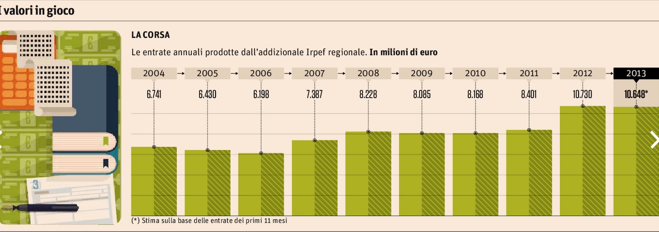 da quest’anno vede salire il proprio limite massimo (escluse le super-aliquote per il deficit sanitario) dall’1,73% al 2,33% per arrivare al 3,33% dal 2015: una regola, scritta nel 2011 in un decreto attuativo del federalismo fiscale (Dlgs 68/2011) con un’entrata in vigore a scoppio ritardato, che se applicata a tutti potrebbe portare il gettito dell’Irpef regionale oltre i 24 miliardi di euro, ben oltre il doppio dei quasi 11 miliardi incassati oggi.