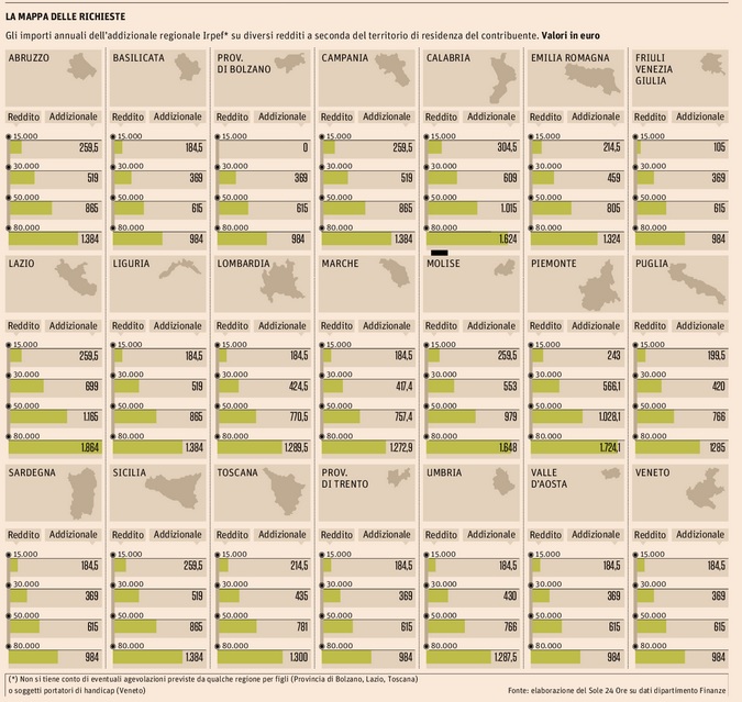 Il Sole 24 Ore ha stilato una tabella completa con tutti gli aumenti delle addizionali Irpef regionali: