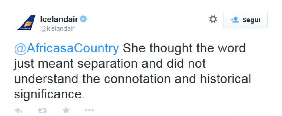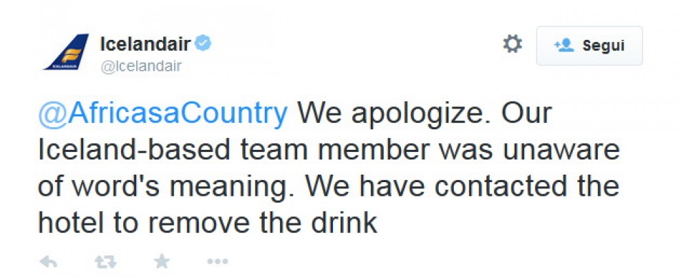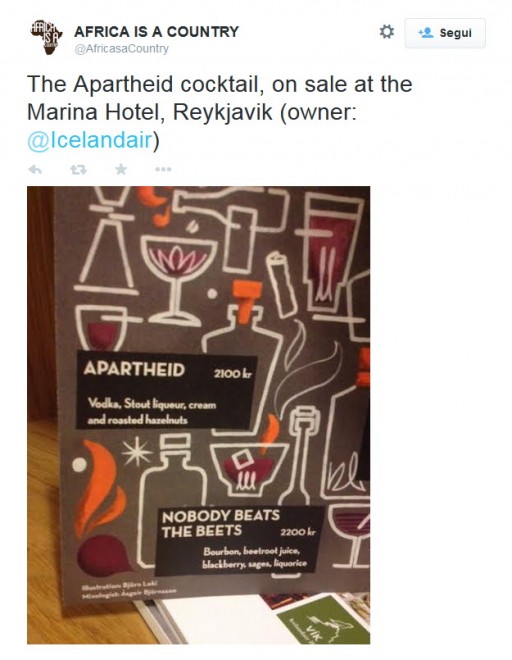ROMA – ” Gustate il nostro Apartheid cocktail“. Il menu del Marina Hotel di Reykjavik, in Islanda, offre ai suoi clienti un cocktail dal nome decisamente poco invitante. Specialmente per l’associazione “Africa is a Country“, che dal suo profilo Twitter ha pubblicato la foto dell’hotel, che fa parte della compagnia Icelandair e chiesto spiegazioni. La compagnia ovviamente ha chiesto scusa, dicendo che la colpa sarebbe di un membro dello staff che ha usato la parola senza conoscerne il significato.