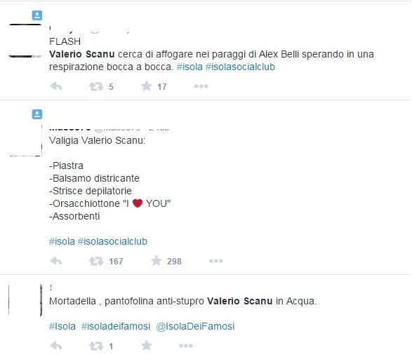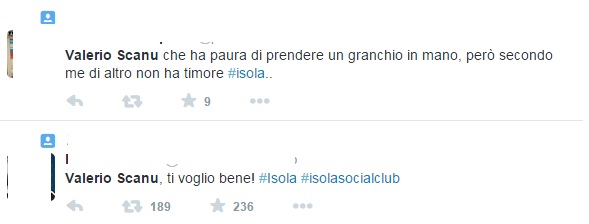 “Valerio Scanu che ha paura di prendere un granchio in mano, però secondo me di altro non ha timore #isola…”.