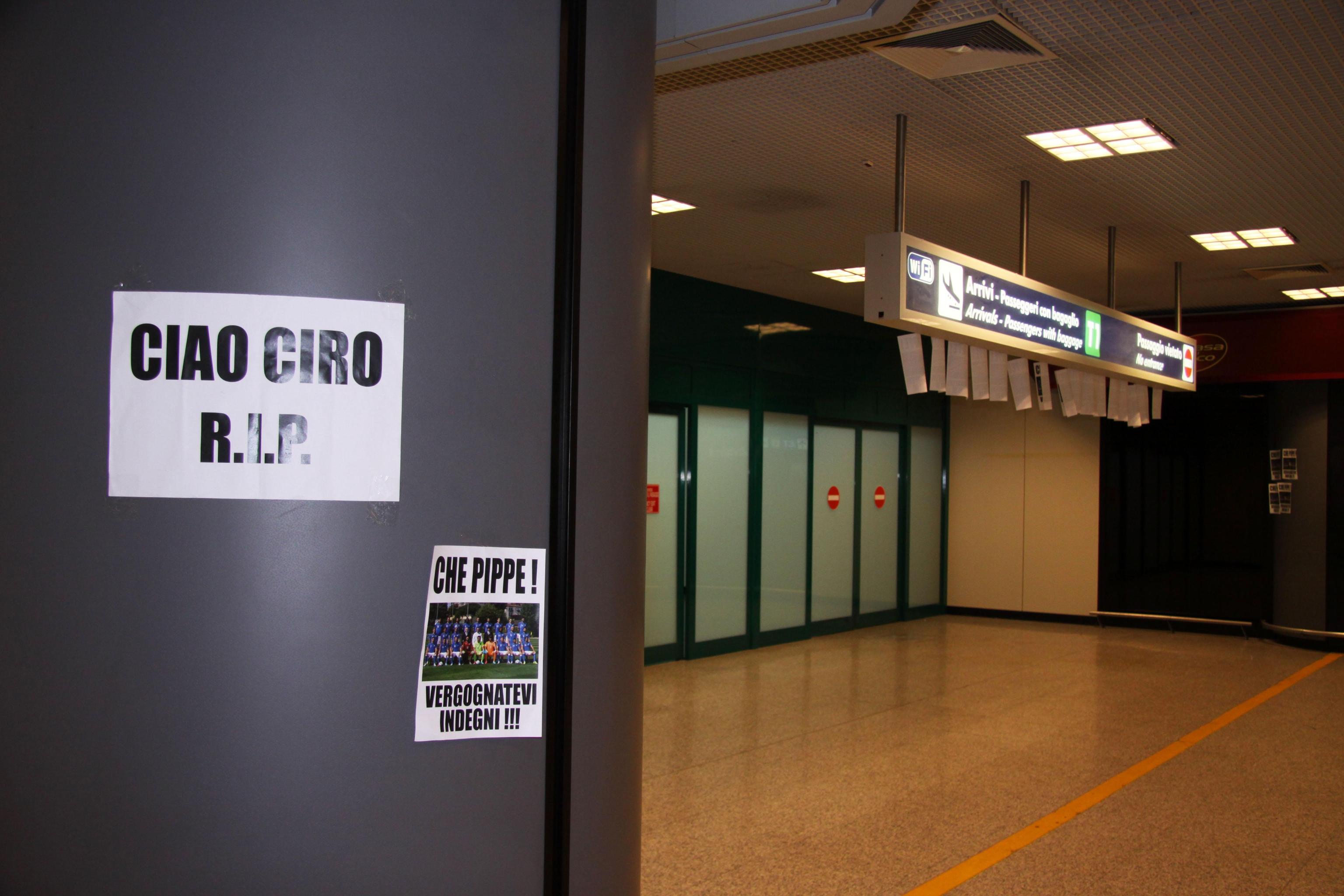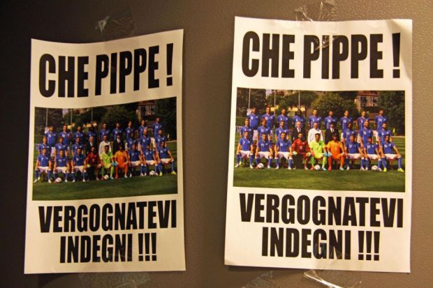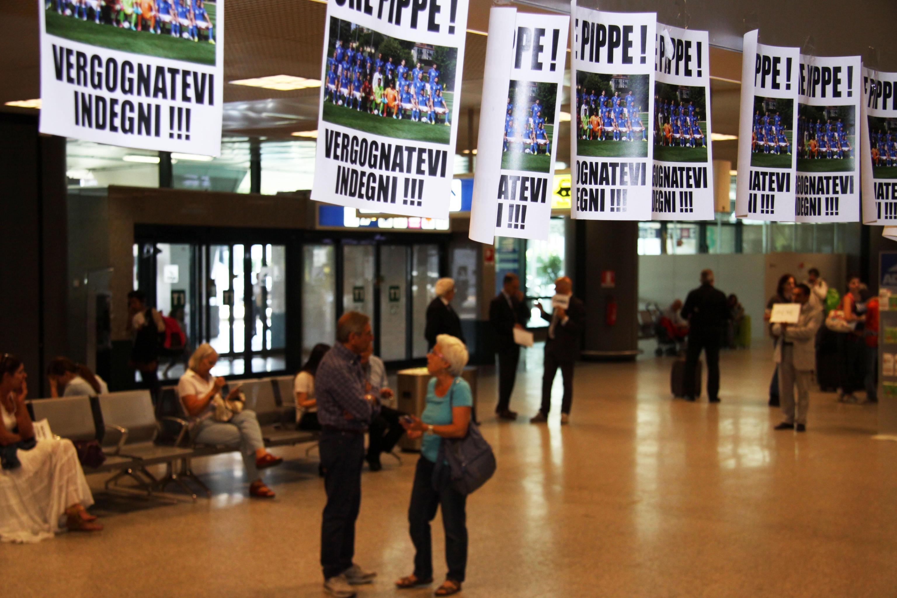 Una ventina di volantini con la foto della Nazionale, e con la scritta “Che pippe! Vergognatevi, indegni!!!“, sono stati affissi nell’aeroporto di Fiumicino, dove poco dopo le 14 è atterrato il Boeing con una sparuta minoranza di calciatori reduci del Brasile.