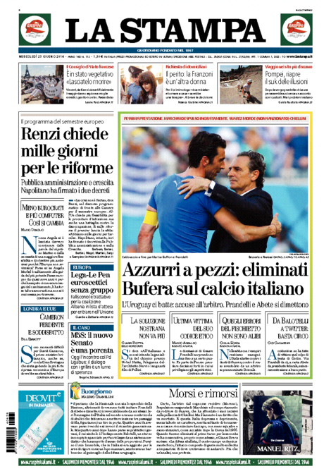 ROMA – “Che pippe”: è questa la prima pagina, dura, anzi durissima, del Tempo dopo l’eliminazione dell’Italia dal Mondiale in Brasile.