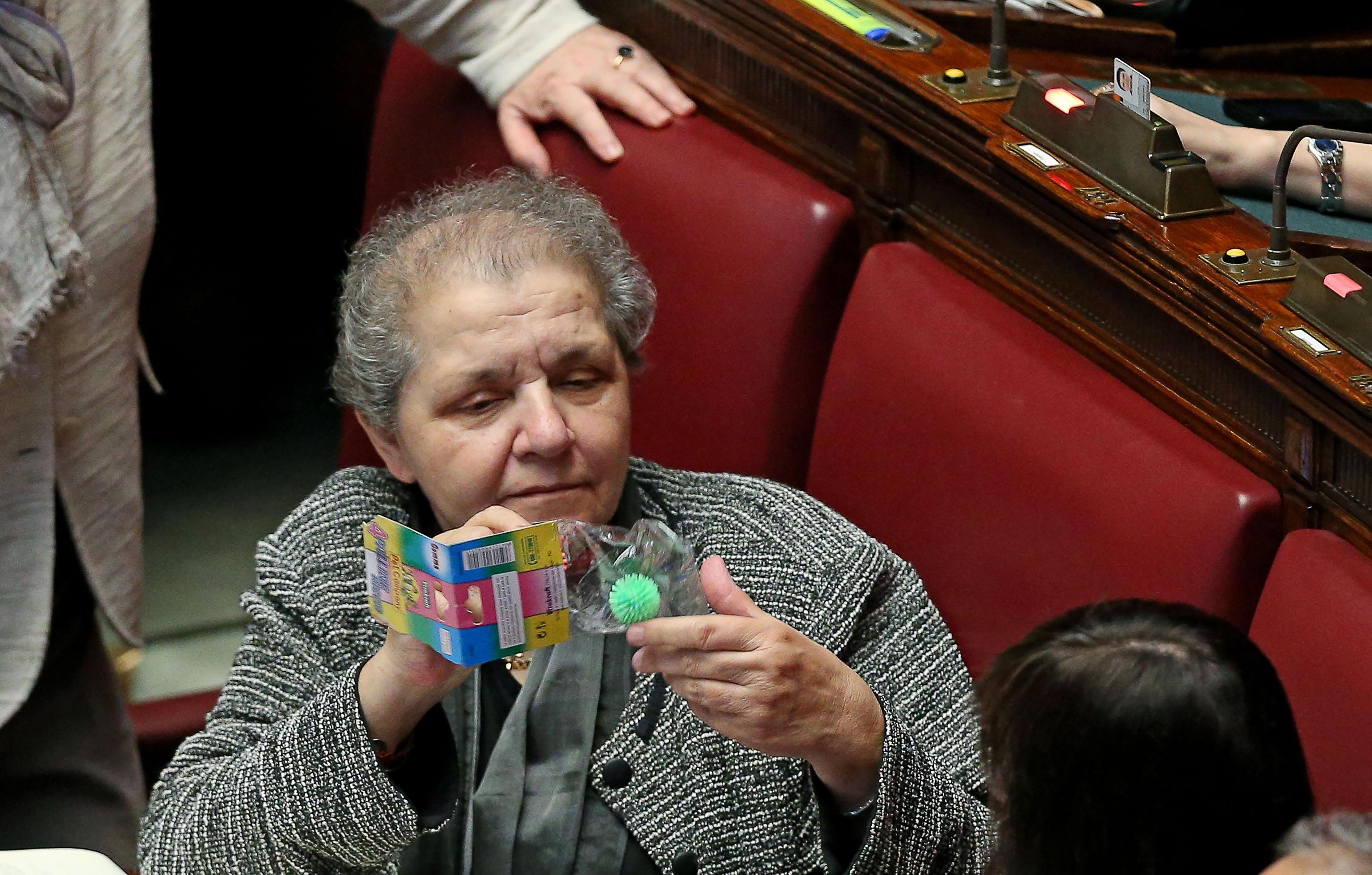 Durante le votazioni sugli ordini del giorno alla legge elettorale la presidente della commissione Antimafia ed esponente della minoranza Pd ha portato in Aula una confezione con tre palline per far giocare i gatti, quelle con dei piccoli tentacoli amatissime dai mici. Ne ha data una ciascuno alla sua compagna di banco, Anna Margherita Miotto, ed una a Silvia Fregolent, che siede dietro di loro. Le due deputate, entusiaste, le hanno “installate” nel meccanismo di voto e le hanno provate sotto lo sguardo soddisfatto di Rosy Bindi.