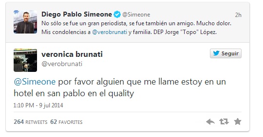 Ma Veronica Brunati, giornalista di “Marca” e moglie della vittima, il giornalista Jorge “Topo” López, non era ancora al corrente della tragica notizia. Poi scoperta in modo traumatico attraverso il Twitter di condoglianze dell’allenatore dell’Atletico Madrid, Diego Pablo Simeone, ignaro di come la donna non fosse ancora stata informata. E’ il caso di dirlo: oltre al danno la beffa.
