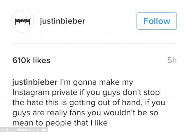 Bieber però non ci sta e non accetta le critiche. Arriva così la minaccia alle Beliebers: “Renderò il mio Instagram privato se non fermate l’odio che vi sta sfuggendo di mano, se voi siete veramente miei fan non dovreste essere così con le persone che mi piacciono“. Insomma, o la smettono oppure non potranno più seguire da vicino il loro beniamino.