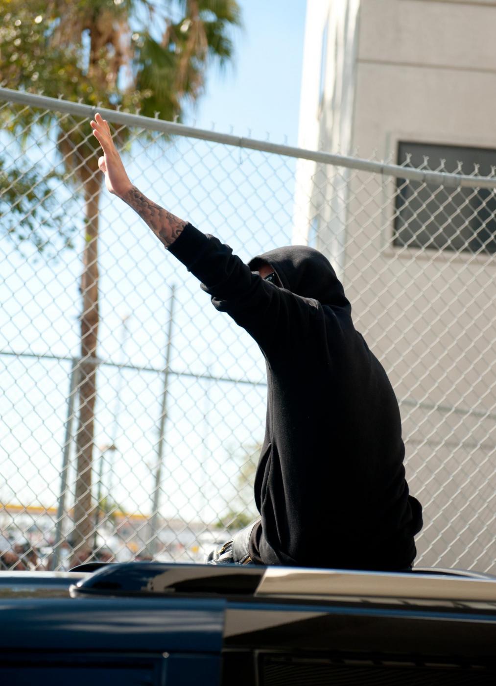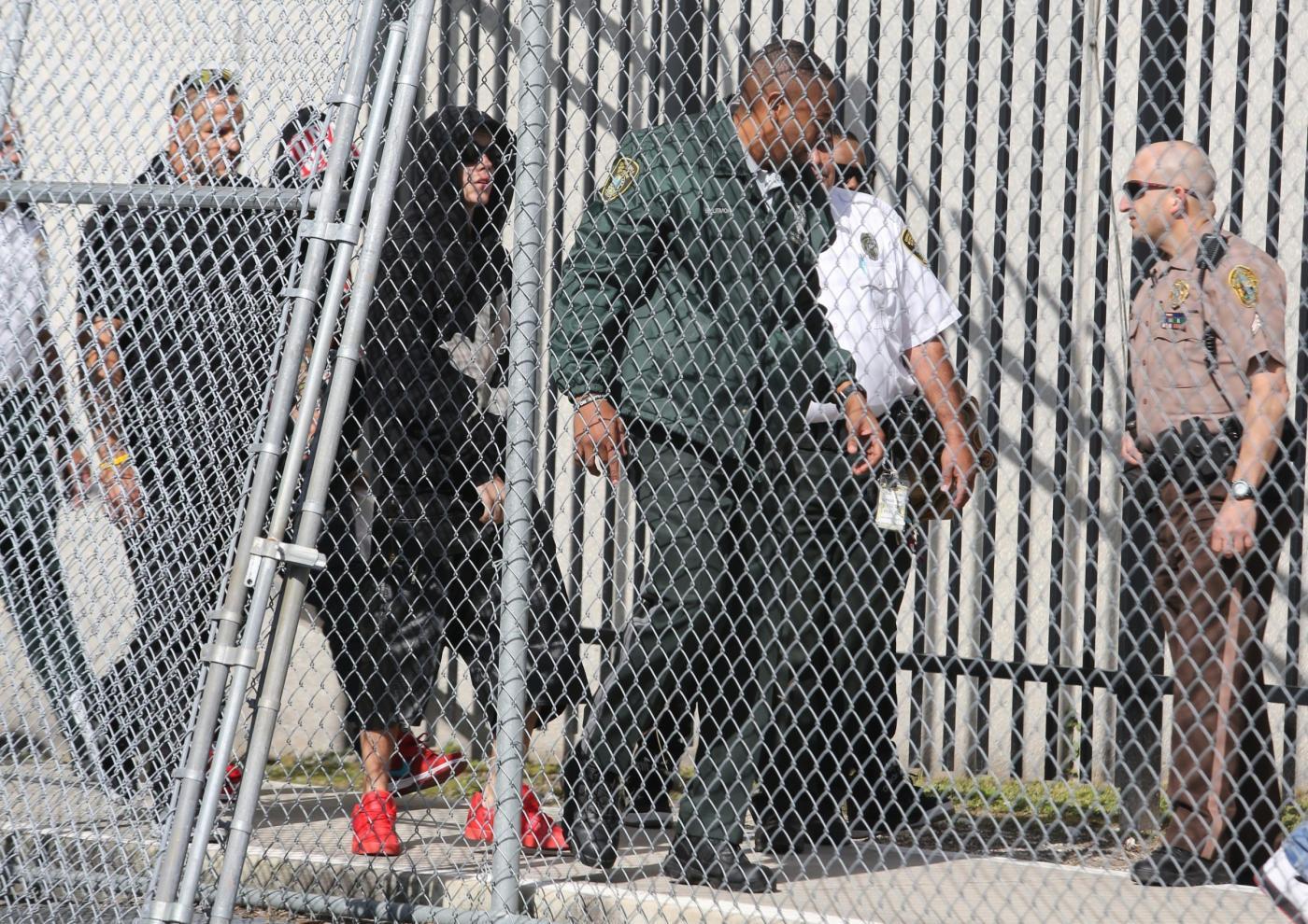 La pop star, che era scortata dalle guardie carcerarie e dal suo personale entourage, è balzato sul tetto di un suv per salutare i fans.