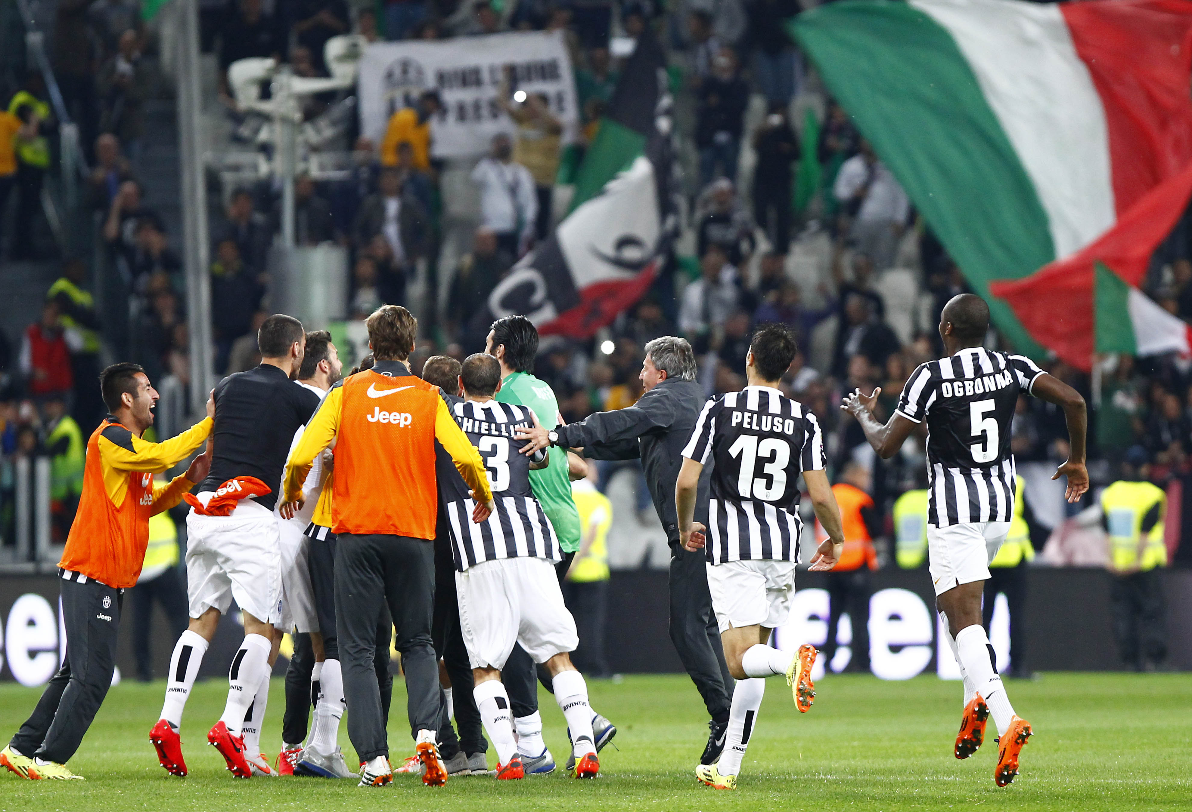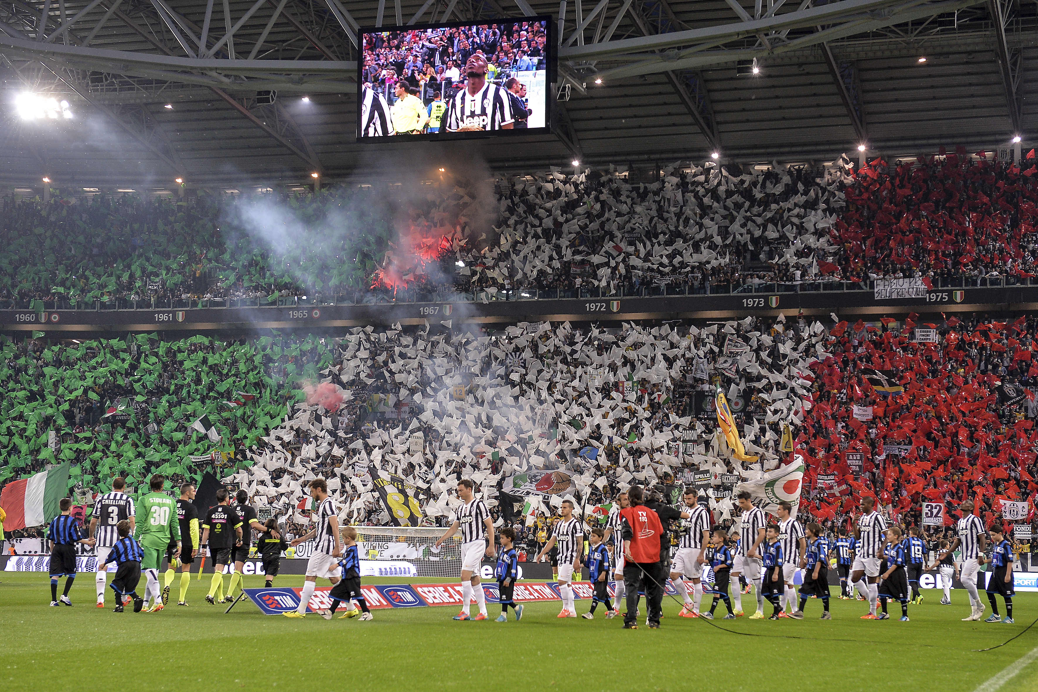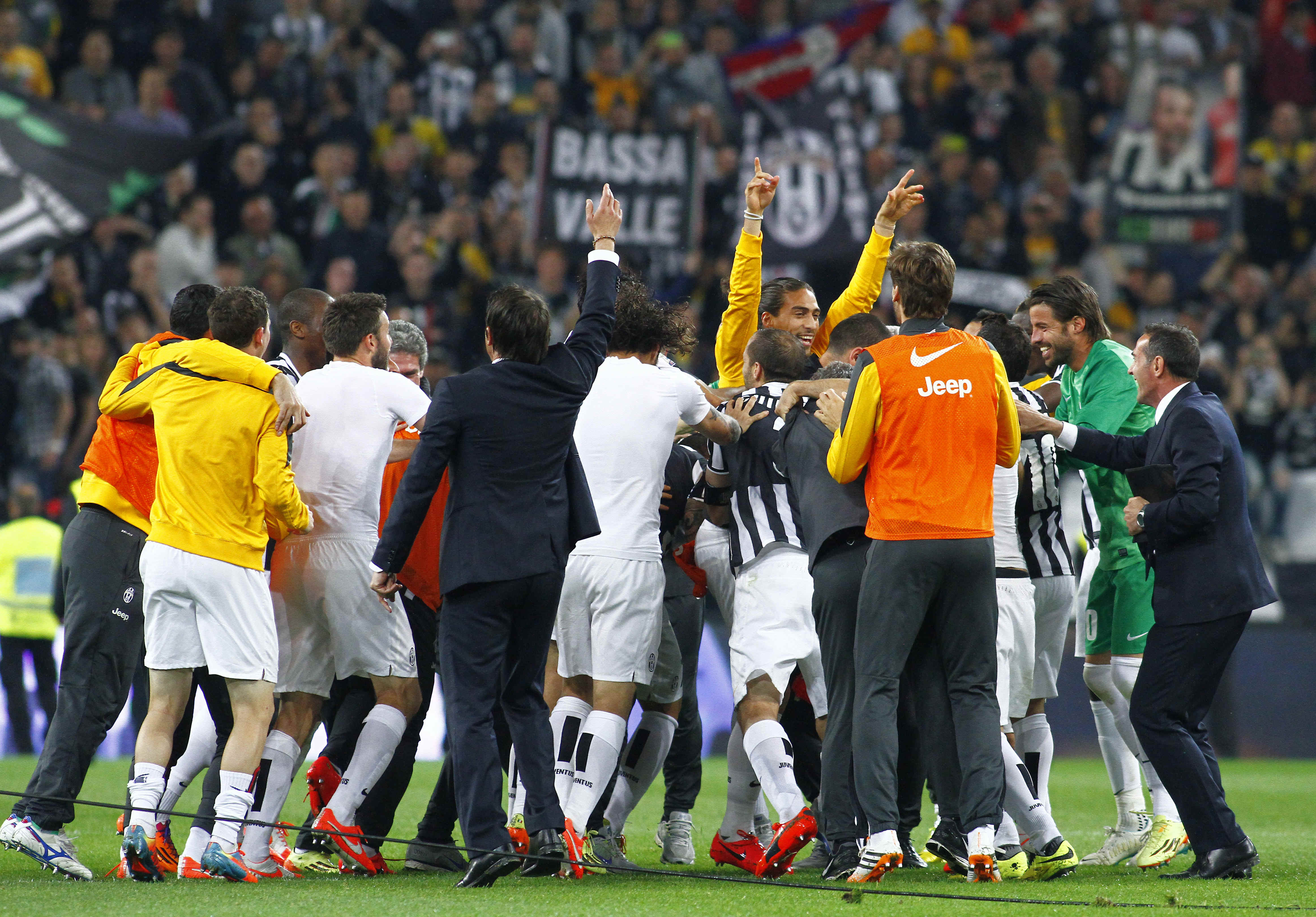 Finisce con il giro del campo di tutta la Juventus, al 18/o successo in casa su 18, dopo gli abbracci tra i giocatori, con Conte che porta per mano la figlioletta che saltella con la maglia bianconera numero 2. Tutto lo stadio applaude e urla “Siamo noi, i campioni dell’Italia siamo noi”, sul sottofondo di un brano di rock duro. Il tripudio finale ravviva finalmente una serata fino a quel momento un po’ anonima, con i rincalzi al posto dei big e un’Atalanta da tempo giĆ in vacanza o quasi. Anche ad uno scudetto, infatti, ci si può fare il callo, soprattutto se ĆØ il terzo consecutivo, il 32/o della storia (verdetti della giustizia sportiva a parte) ed era annunciato da tempo.
