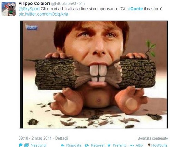 Obiettivo principale degli sfottò è Antonio Conte: una volta è rappresentato come un castoro che rosica, un’altra volta è impegnato in un dialogo immaginario con Beppe Grillo. Ma non mancano i riferimenti agli arbitri (che in Europa non sarebbero così “amichevoli” come in Italia) e sarcasmo sul palmares europeo della Juve, tutto sommato modesto se paragonato a quanto la squadra ha saputo vincere in Italia.