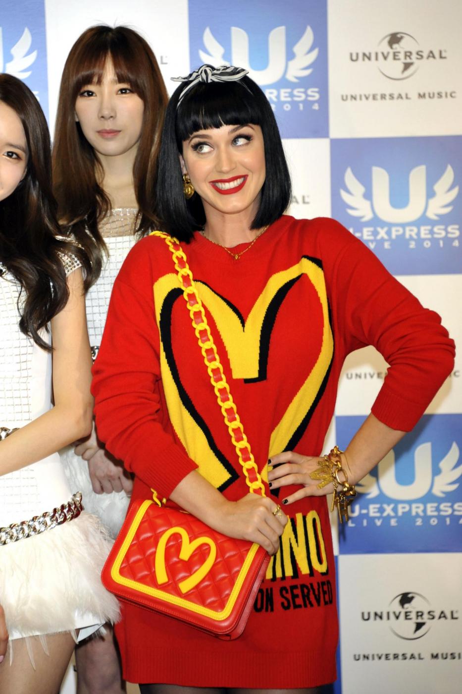 Con questa mise firmata dalla maison italiana Moschino, Katy Perry si è presentata alla conferenza stampa dell’evento musicale U-Express Live 2014 a Saitama, in Giappone, dove si è poi esibita in concerto. La popstar è amica e ammiratrice di Jeremy Scott, che ha esordito con la sua prima collezione per la griffe nostrana alla settimana milanese della moda di febbraio. In quell’occasione la cantante si era presentata con quasi un’ora di ritardo ed era stata accolta tra i fischi.