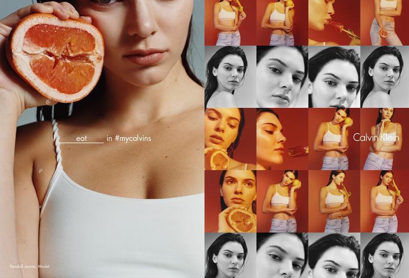 Scattata dall’avanguardista Harley Weir, fotografa inglese famosa per i suoi scatti crudi e diretti, nella campagna di Ck campeggiano le immagini di Kendall Jenner mentre strizza tra le mani mezzo pompelmo, per alcuni un rimando implicito ai genitali femminili, e dell’artista ed ex modella Saskia De Brauw immortalata mentre con una mano si copre il seno e con l’altra sembra allontanare una schiena maschile.