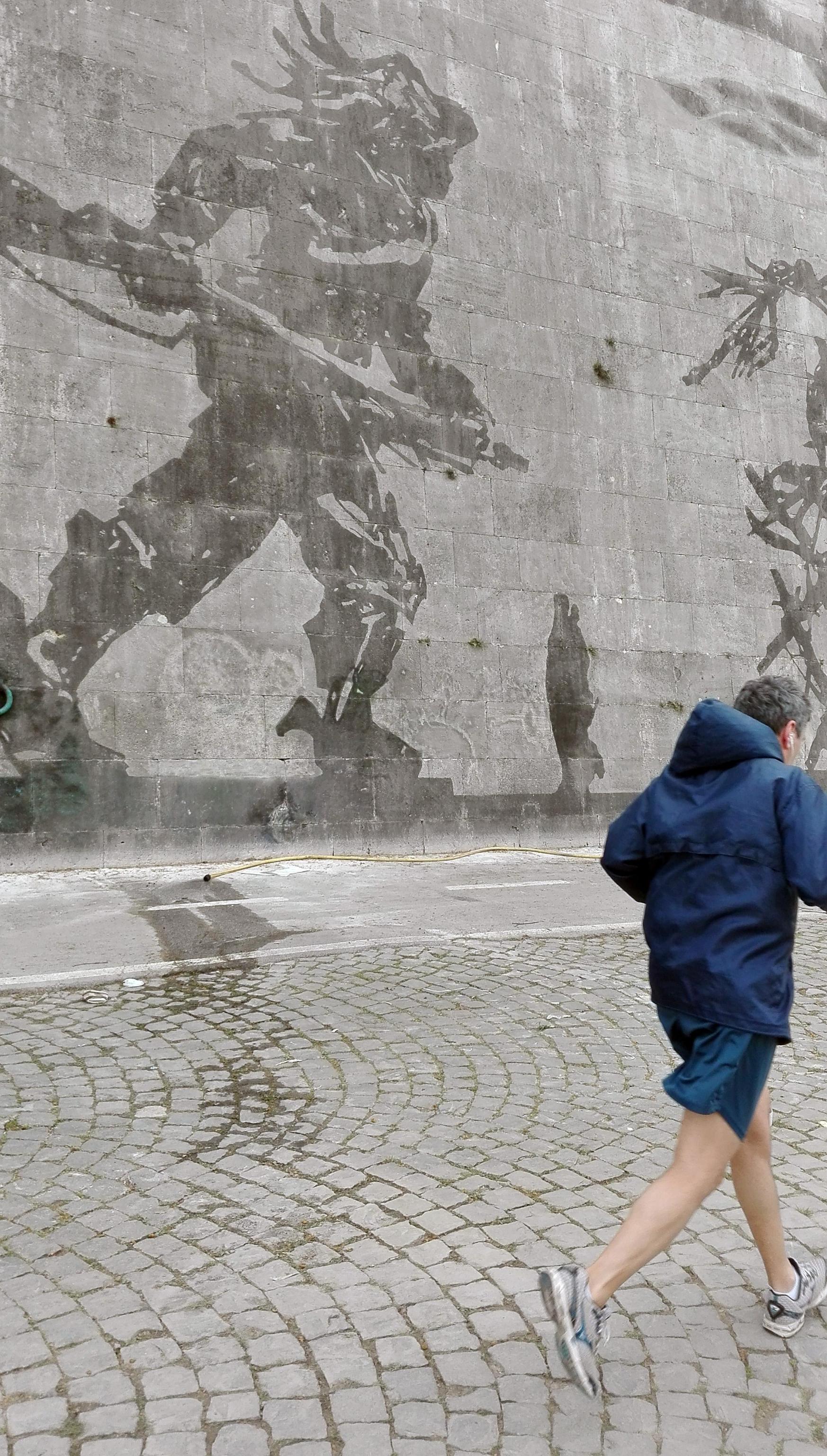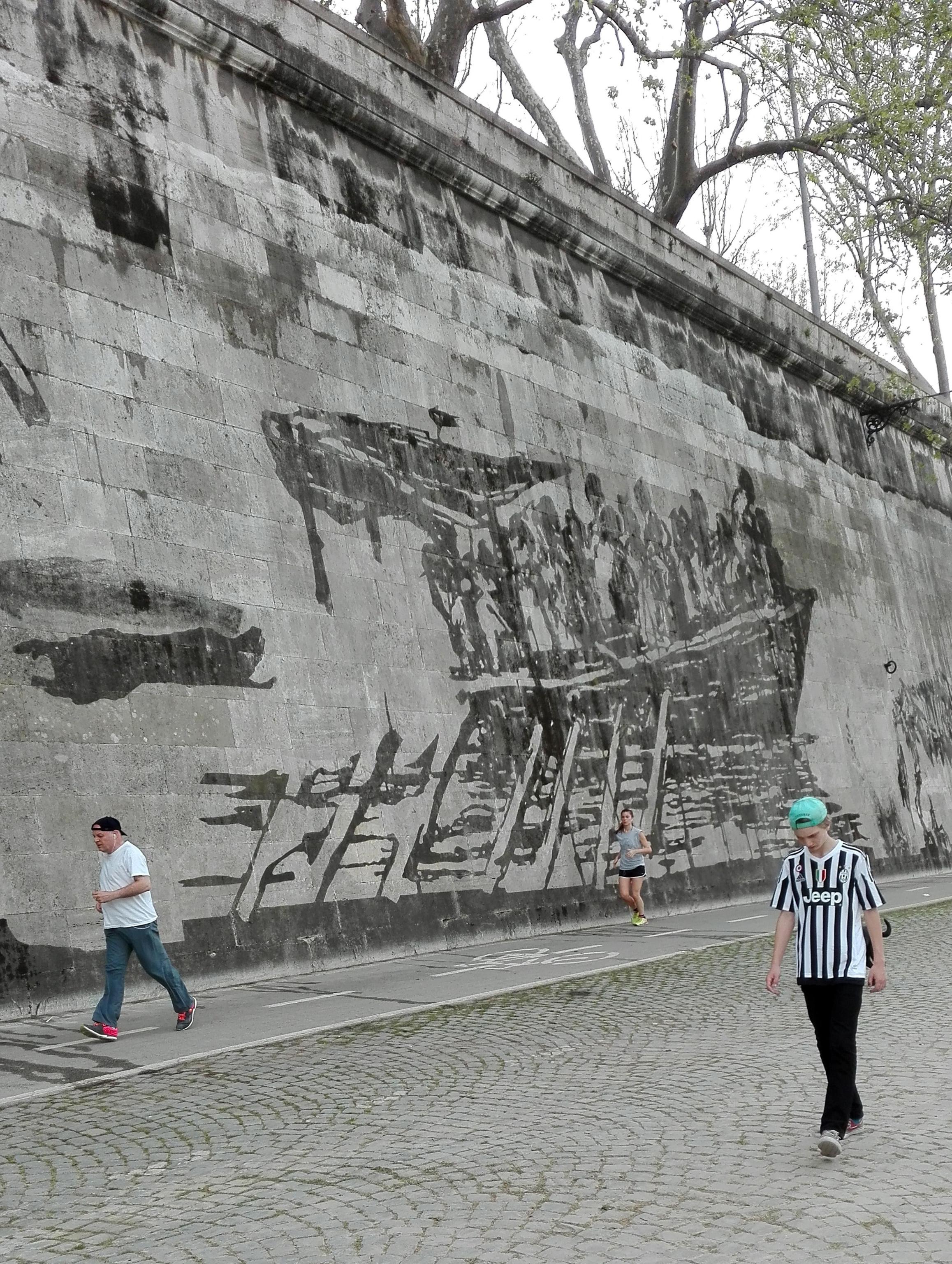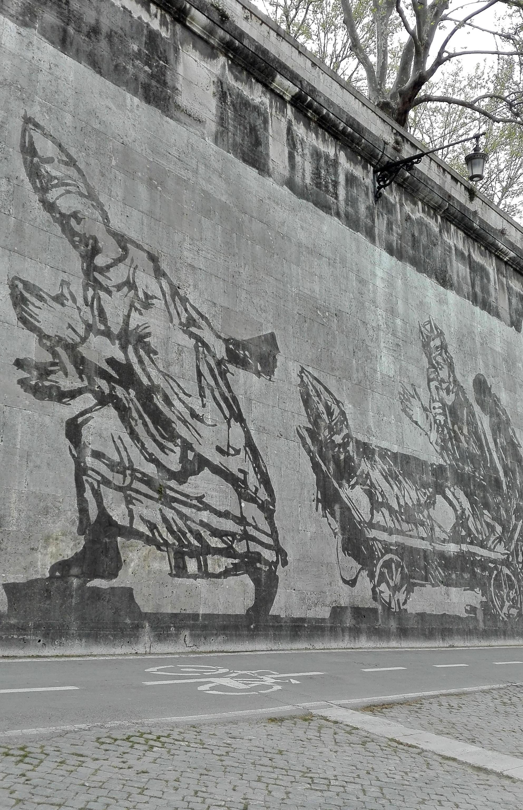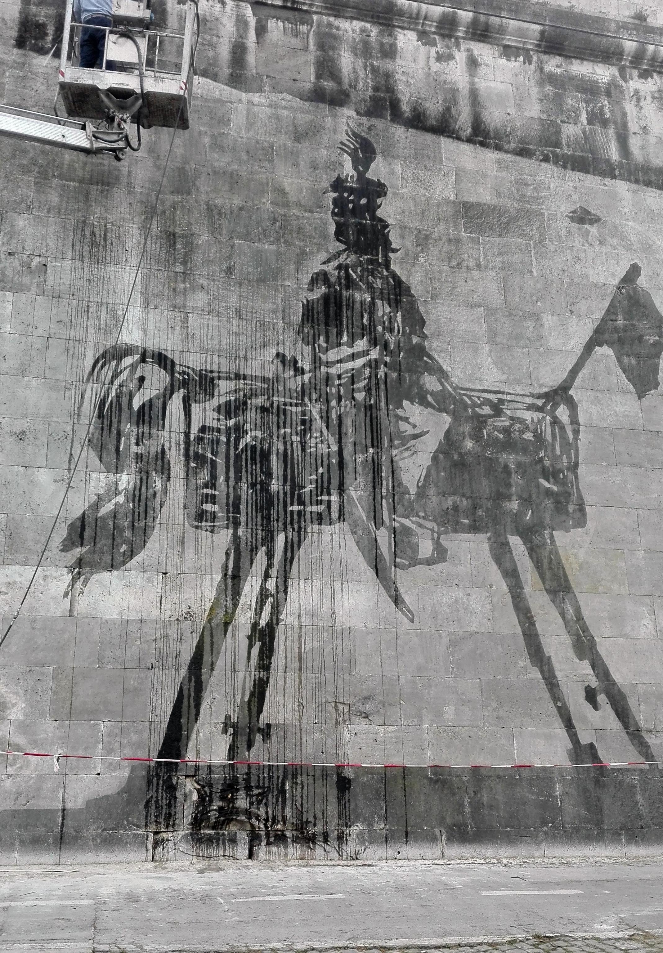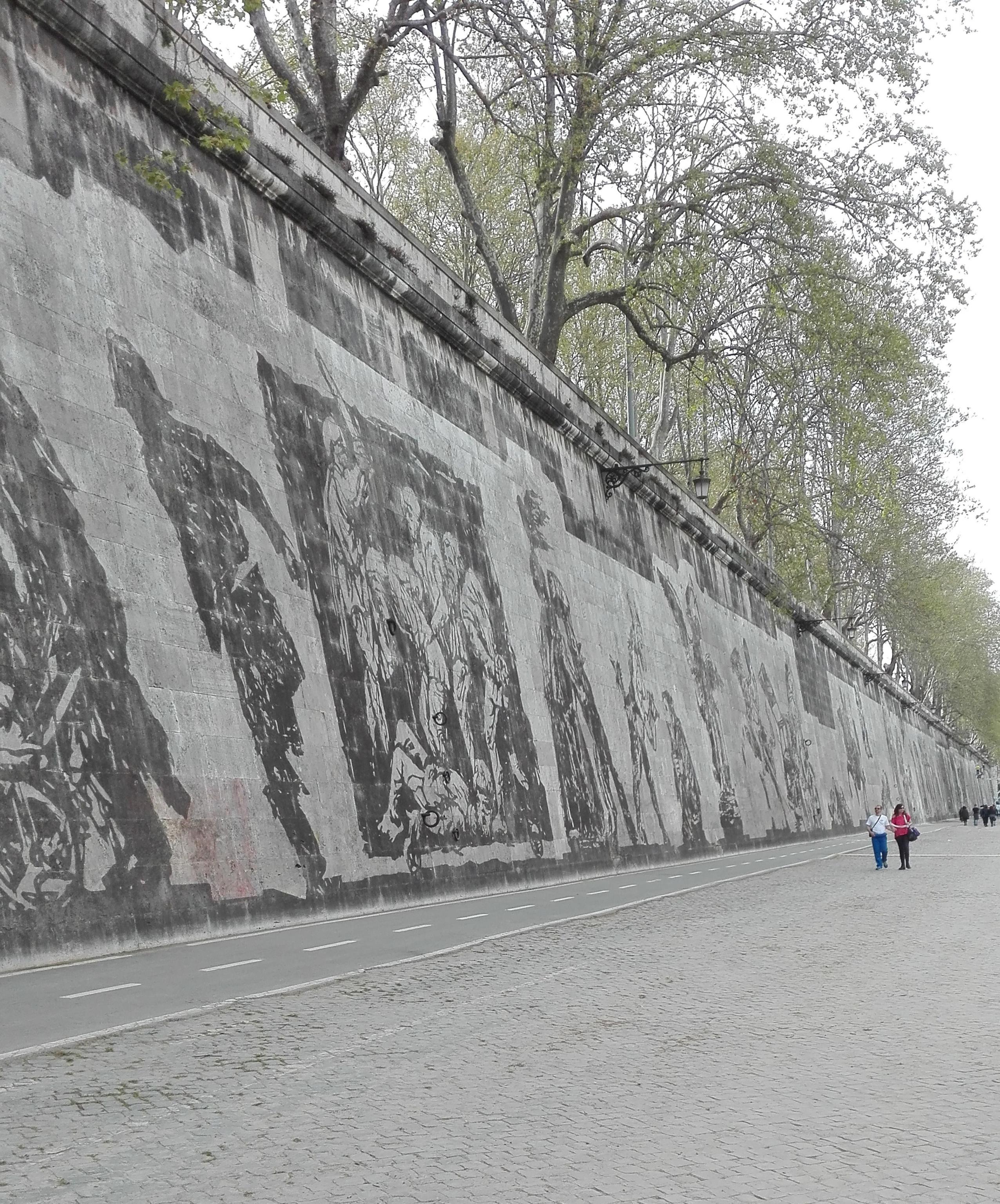 l’opera dell’artista sudafricano è lunga 550 metri, con 80 figure alte fino a 10 metri realizzate sui muraglioni del Lungotevere fra Ponte Sisto e Ponte Mazzini. “Triumps and Laments” racconta la storia millenaria di Roma. “Ogni storia ha una sua parte negativa o di vergogna. Ogni trionfo corrisponde a un lamento, alla sconfitta di qualcun altro”, spiegava Kentridge all’inaugurazione. L’imponente opera “site specific” è stata realizzata senza colori né vernici, ma solo pulendo la patina biologica accumulata negli anni sul travertino bianco dei muraglioni.