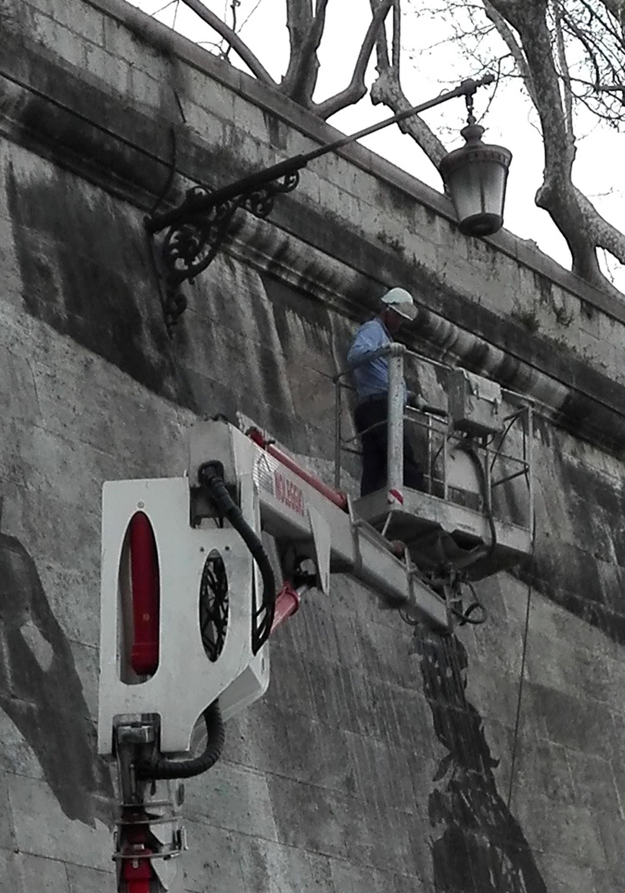 Una immagine dell’opera corale site-specific dell’artista sudafricano William Kentridge, ‘Triumphs and laments’, riguardante la ‘ripulitura’ del tratto delle banchine del Tevere fra Ponte Mazzini e Ponte Sisto, in una foto scattata il 2 aprile 2016, nella fase finale dei lavori. Verrà inaugurata il prossimo 21 aprile, in occasione del Natale di Roma. Attraverso l’idropulitura della patina biologica accumulatasi sui muraglioni di travertino, l’artista sudafricano ha realizzato più di 80 figure alte 10 metri per una lunghezza di 550 metri con cui ha ricostruito le grandi tensioni che hanno animato la storia sociale della Città Eterna dalle origini ad oggi. ANSA / ALESSANDRA CHINI