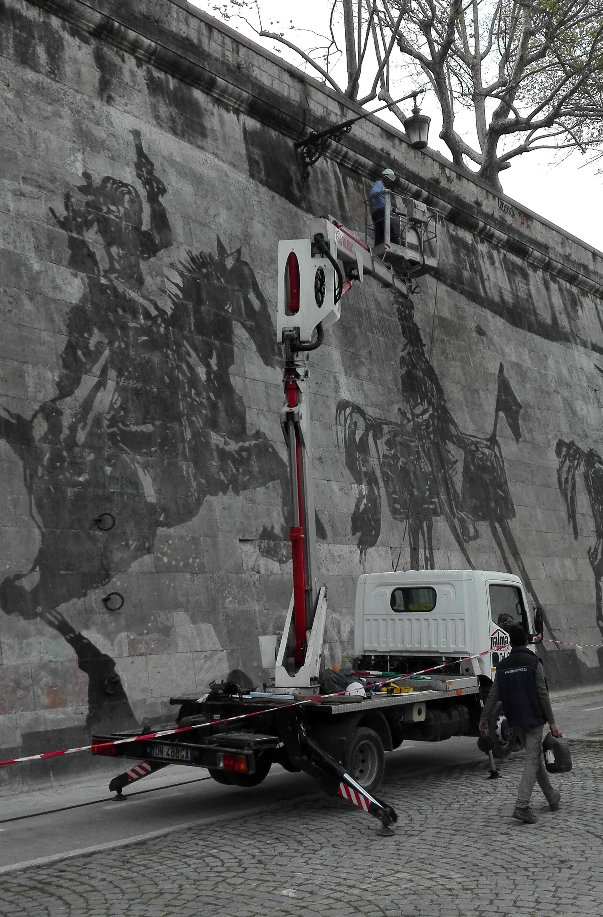 Una immagine dell’opera corale site-specific a mano dell?artista sudafricano William Kentridge, denominata ‘Triumphs and laments’, riguardante la ‘ripulitura’ del tratto delle banchine del Tevere fra Ponte Mazzini e Ponte Sisto, in una foto scattata il 2 aprile 2016, nella fase finale dei lavori. Verrà inaugurata il prossimo 21 aprile, in occasione del Natale di Roma. Attraverso l’idropulitura della patina biologica accumulatasi sui muraglioni di travertino, l’artista sudafricano ha realizzato più di 80 figure alte 10 metri per una lunghezza di 550 metri con cui ha ricostruito le grandi tensioni che hanno animato la storia sociale della Città Eterna dalle origini ad oggi. ANSA / ALESSANDRA CHINI