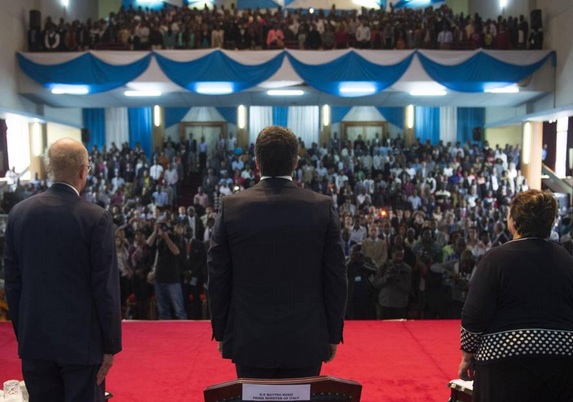 E non solo lì: durante il suo viaggio Renzi ha infatti tenuto anche un discorso all’Università di Nairobi ancora scossa per la strage dello scorso aprile nella quale rimasero uccisi 150 studenti. Anche qui, sotto la giacca, il giubbotto era ben riconoscibile.