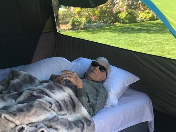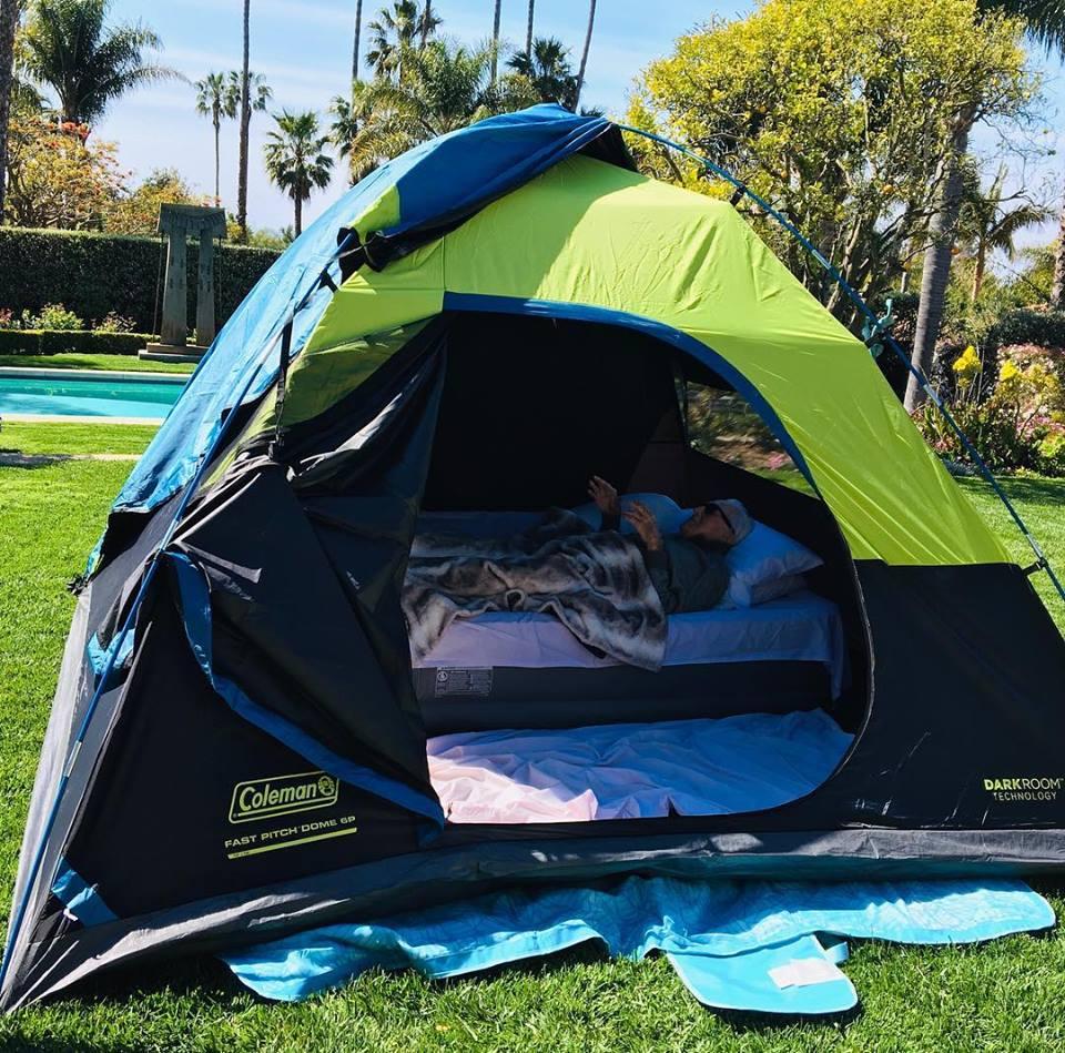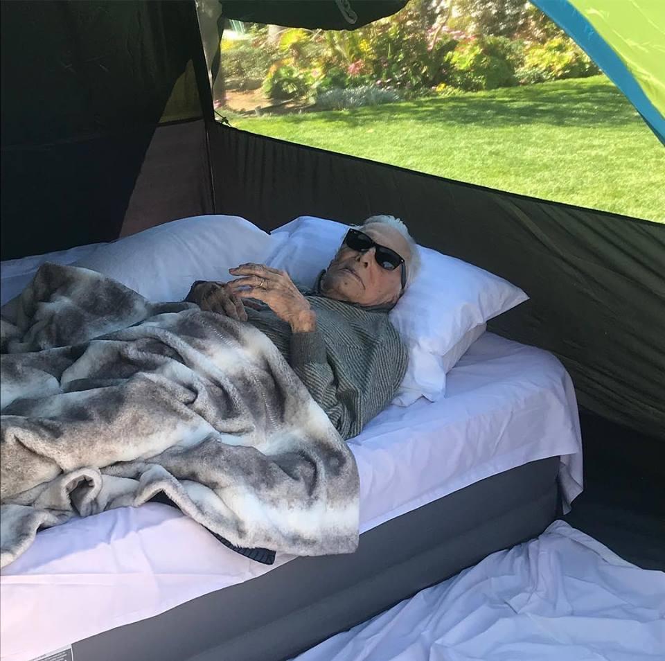 Kirk riposa su un materassino all’interno di una canadese piantata nel giardino di casa. Non si tratta, quindi, di un vero e proprio camping ma la foto è stata comunque scattata all’interno di una tenda ed è diventata virale.